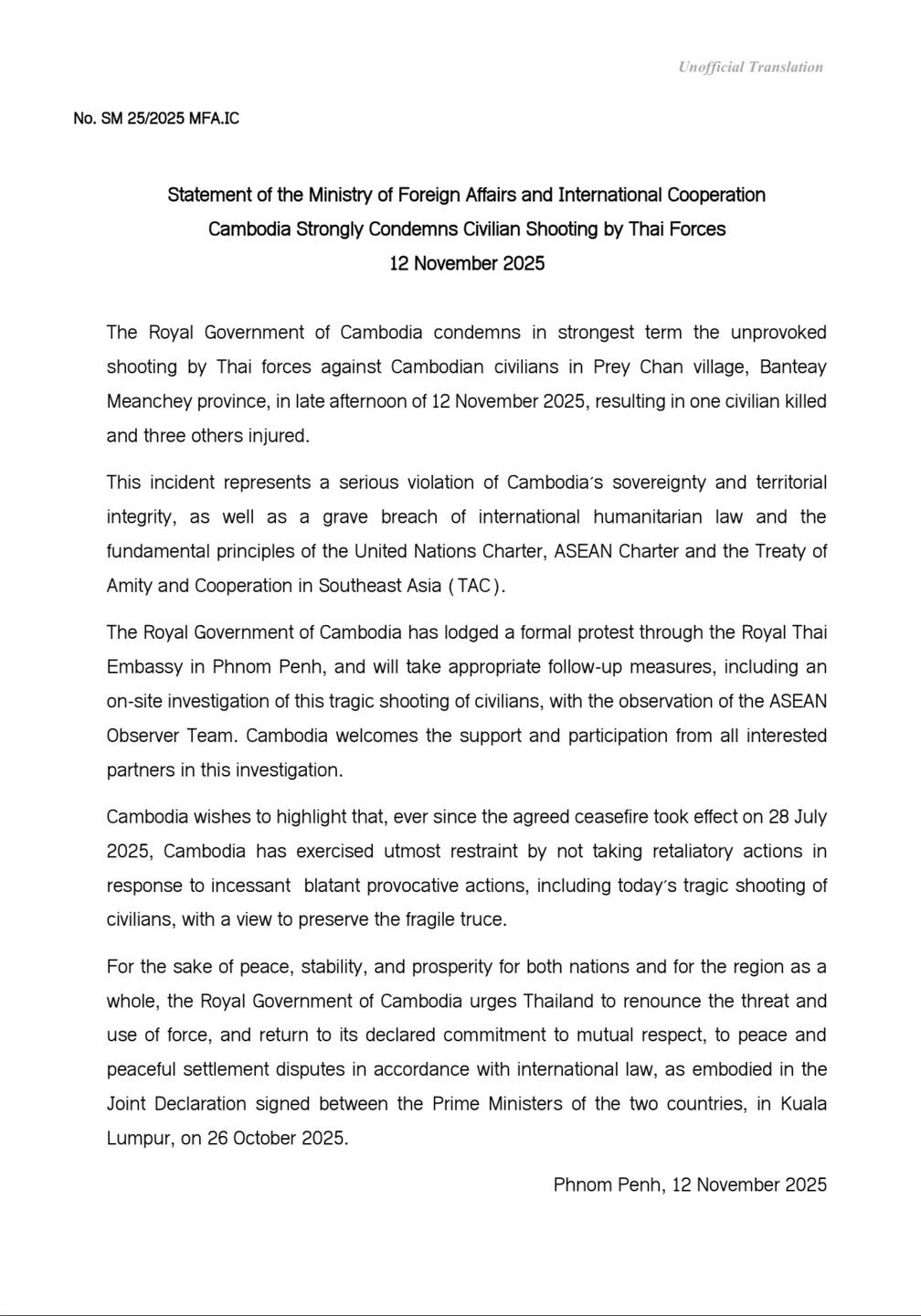 MFAIC statement: Cambodia strongly condemns the civilian shooting by Thai forces on 12 November 2025