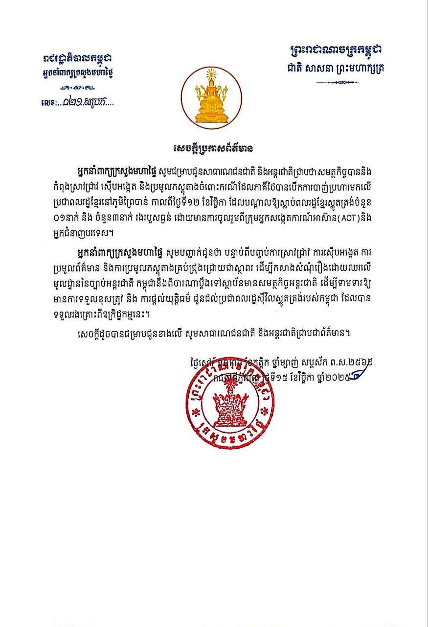 នៅថ្ងៃទី១៥ ខែវិច្ឆិកា ឆ្នាំ២០២៥ អ្នកនាំពាក្យក្រសួងមហាផ្ទៃ បានប្រកាសថា អាជ្ញាធរមានសមត្ថកិច្ច ដោយមានការចូលរួមពីក្រុមអ្នកសង្កេតការណ៍អាស៊ាន (ASEAN Observer Team) និងអ្នកជំនាញបរទេស បានកំពុងធ្វើការស៊ើបអង្កេតលើករណីដែលបង្កឡើងដោយកងទ័ពថៃកាលពីថ្ងៃទី១២ ...