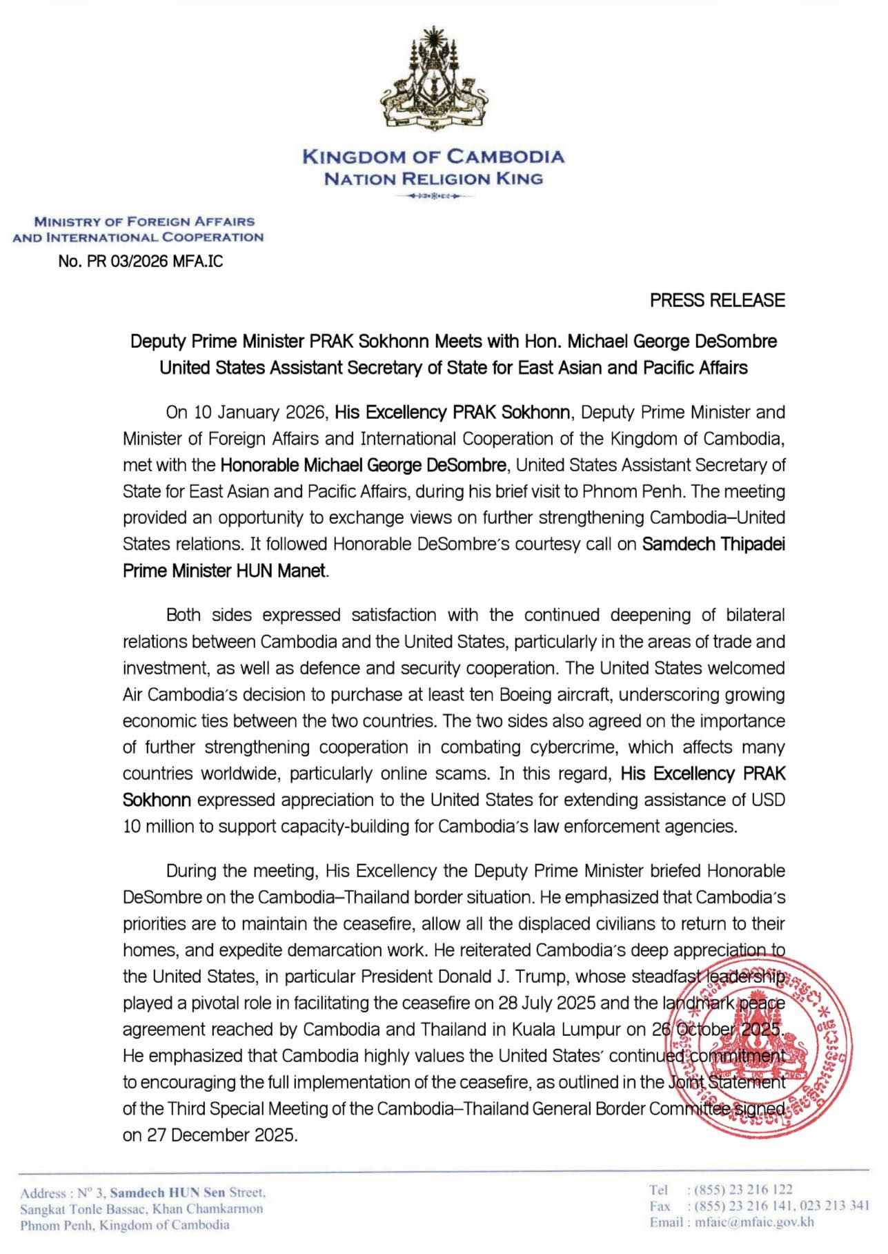 On 10 January 2026, the Ministry of Foreign Affairs and International Cooperation issued a press release regarding Deputy Prime Minister PRAK Sokhonn’s meeting with Hon. Michael George DeSombre, United States Assistant Secretary of State for East Asian and Pacific Affairs.His Excellency the Deputy Prime Minister ...