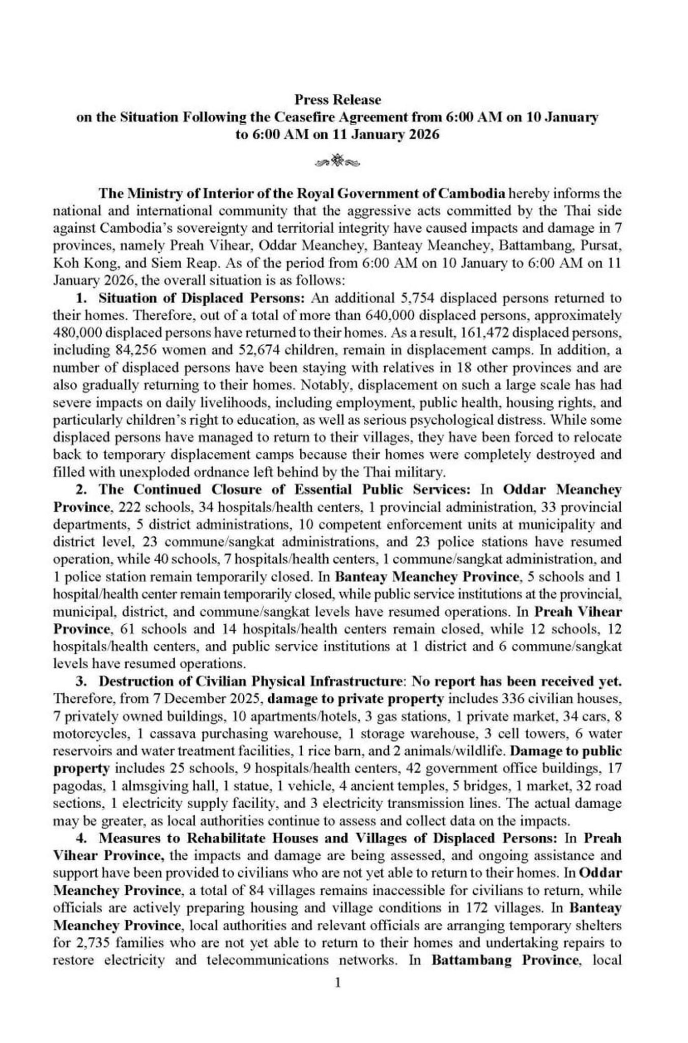 On 11 January 2026, the Ministry of Interior issued a press release on the situation following the ceasefire agreement from 6:00 AM on 10 January to 6:00 AM on 11 January 2026.An additional 5,754 displaced persons returned to their homes. Therefore, out of a total ...
