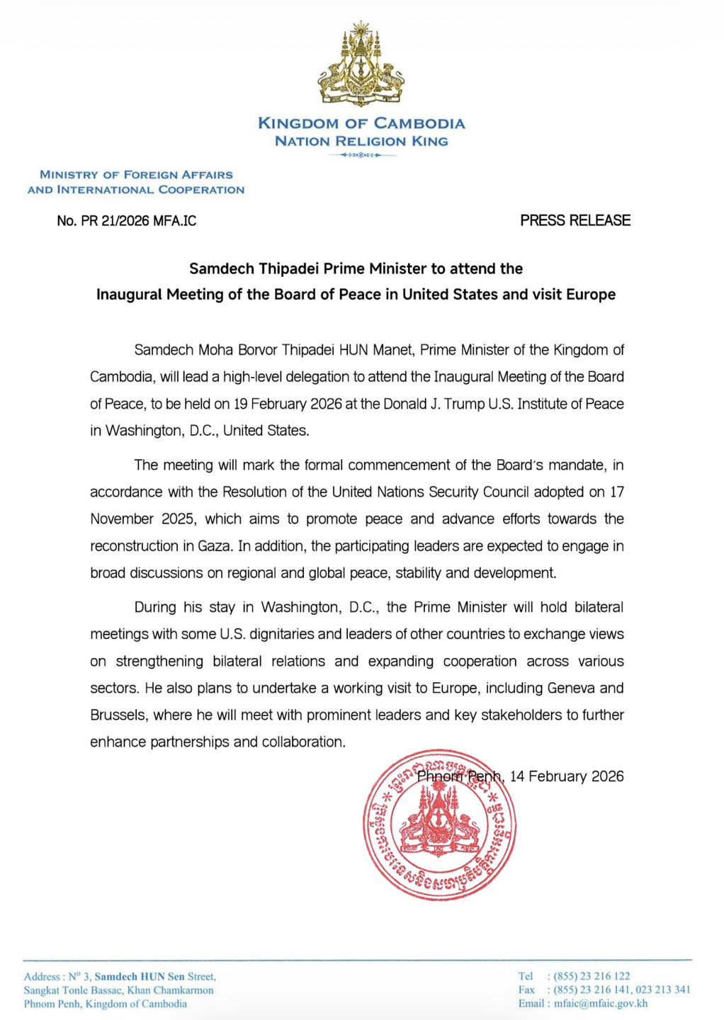 On 14 February 2026, the Ministry of Foreign Affairs and International Cooperation issued a press release regarding Samdech Thipadei Prime Minister to attend the inaugural meeting of the Board of Peace in United States and visit Europe.During his stay in Washington, D.C., the Prime Minister ...