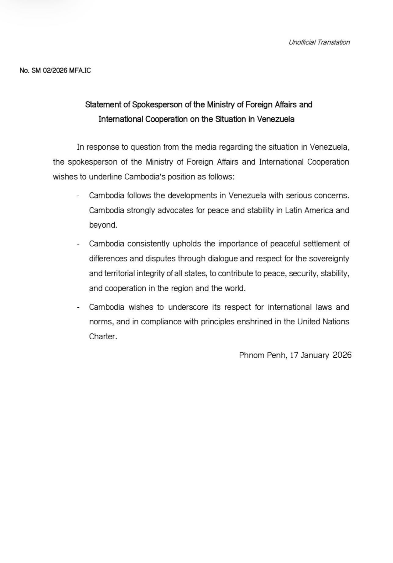 • On 17 January 2026, the Ministry of Foreign Affairs and International Cooperation issued a statement of spokesperson of the Ministry of Foreign Affairs and International Cooperation on the situation in Venezuela.Cambodia follows the developments in Venezuela with serious concerns. Cambodia strongly advocates for peace and ...