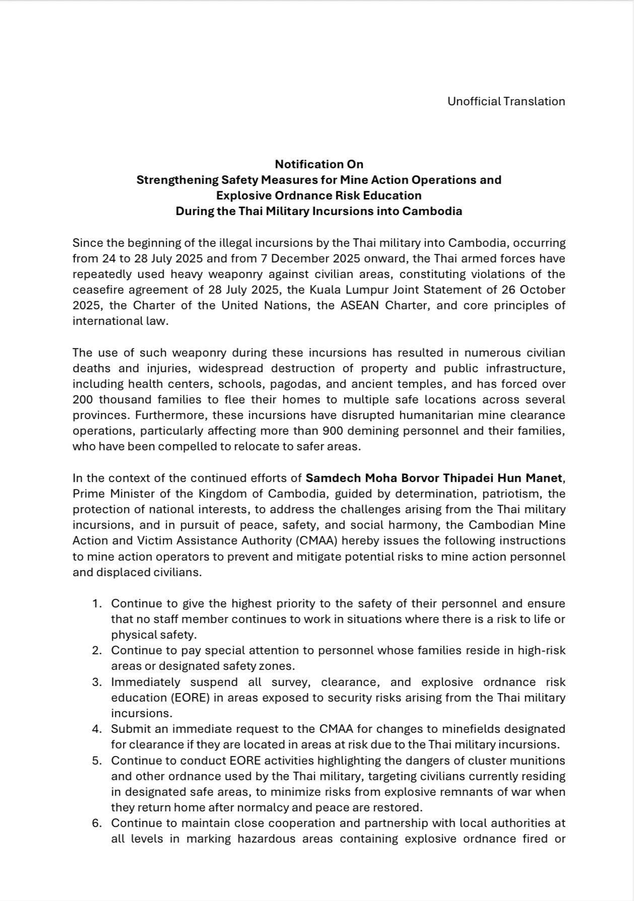 On 26 December 2025, the Cambodian Mine Action and Victim Assistance Authority issued a notification on strengthening safety measures for mine action operations and explosive ordnance risk education during the Thai Military incursions into Cambodia.The use of such weaponry during these incursions has resulted in ...
