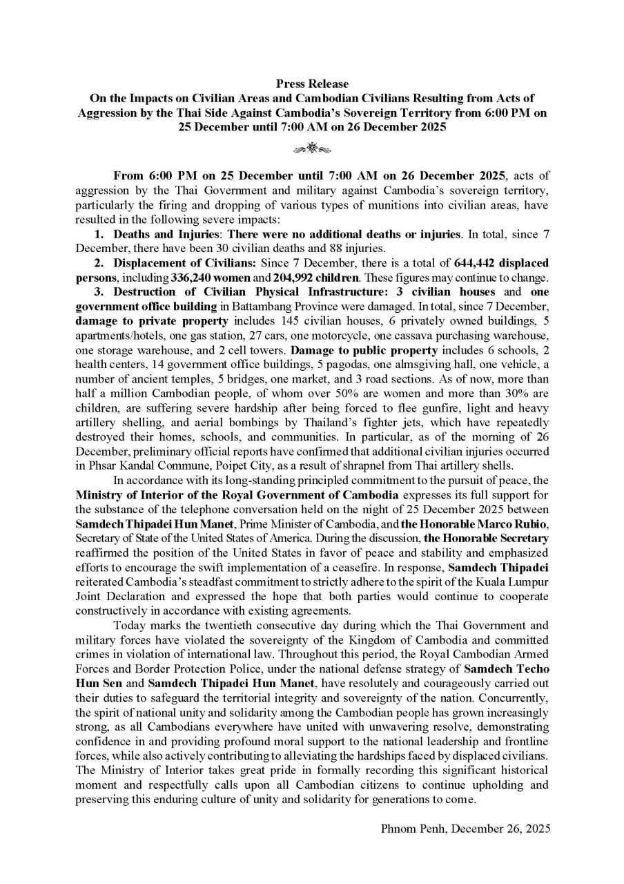On 26 December 2025, the Ministry of Interior issued a press release on the impacts on civilian areas and Cambodian civilians resulting from acts of aggression by the Thai Government and Military against Cambodia’s sovereign territory from 6:00 PM on 25 December until 7:00 AM ...