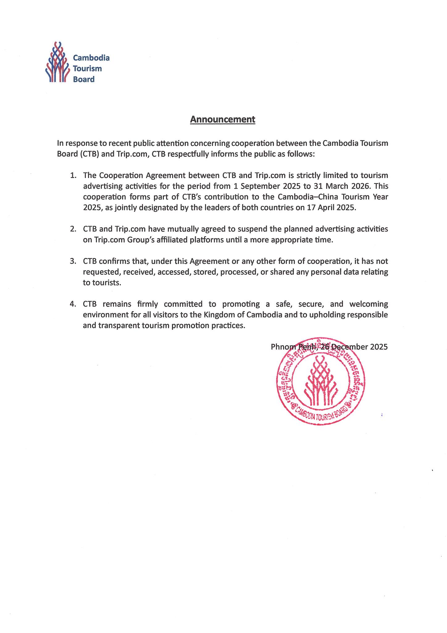 On 26 December 2025, the Cambodia Tourism Board (CTB) issued an announcement on the collaboration between the Cambodia Tourism Board (CTB) and Trip.com.The cooperation agreement between CTB and Trip.com is strictly limited to tourism advertising activities for the period from 1 September 2025 to 31 ...