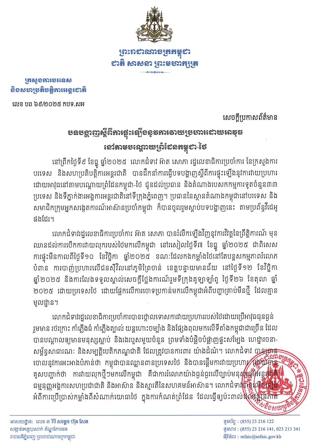 On 10 December 2025, the Ministry of Interior issued a press release informing the national and international community that Thailand’s violations of international law and breaches of the ceasefire against Cambodia’s sovereign territory have caused severe impacts on civilian safety, destruction of infrastructure, pagodas, cultural ...
