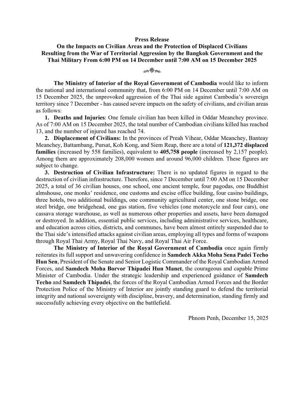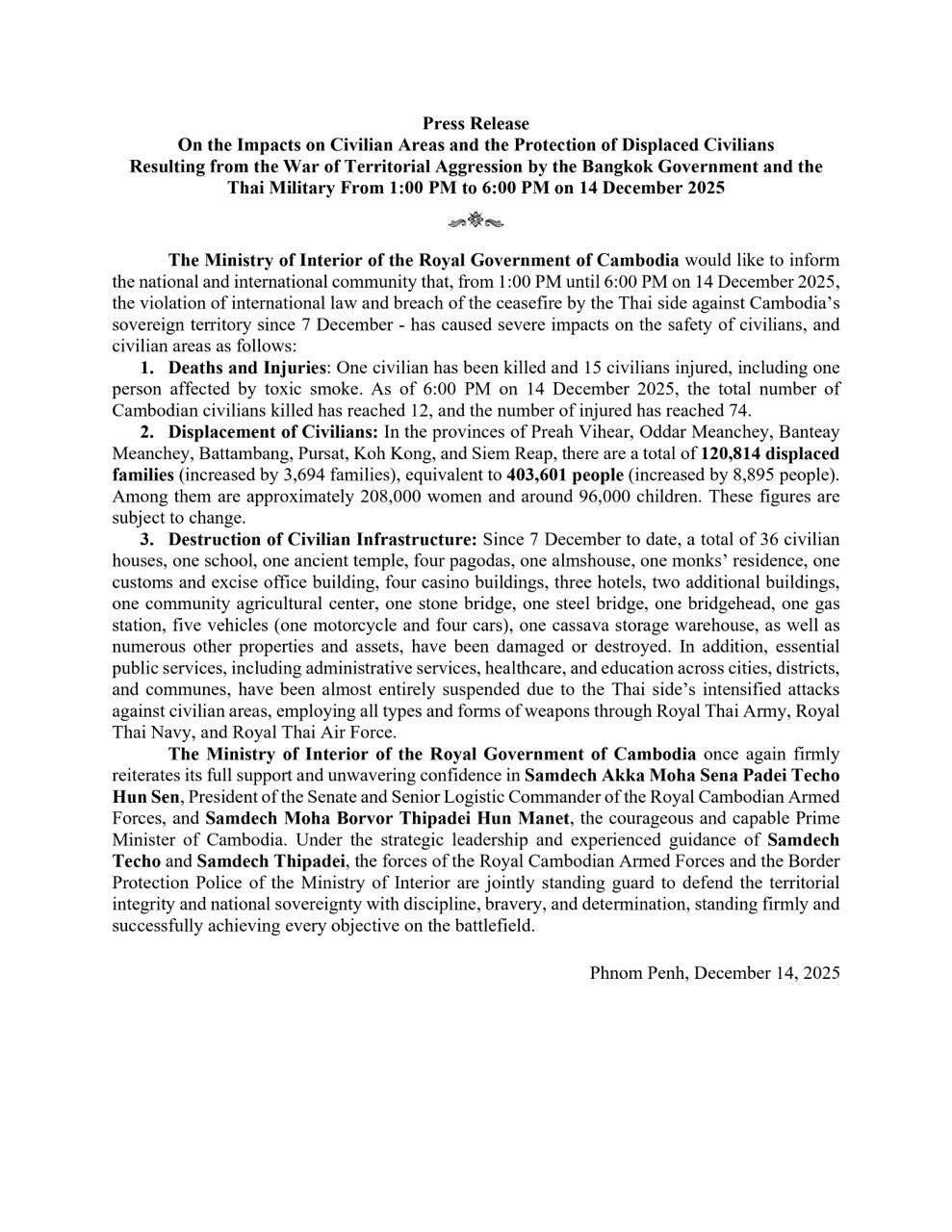• On 13 December 2025, the Ministry of Interior stated the suspension of Cambodia-Thailand border crossings, effective immediately until further notice, due to the evolving border situation where the Thai side continues to invade and attack Cambodia’s sovereign territory indiscriminately, causing casualties to the Cambodian people ...