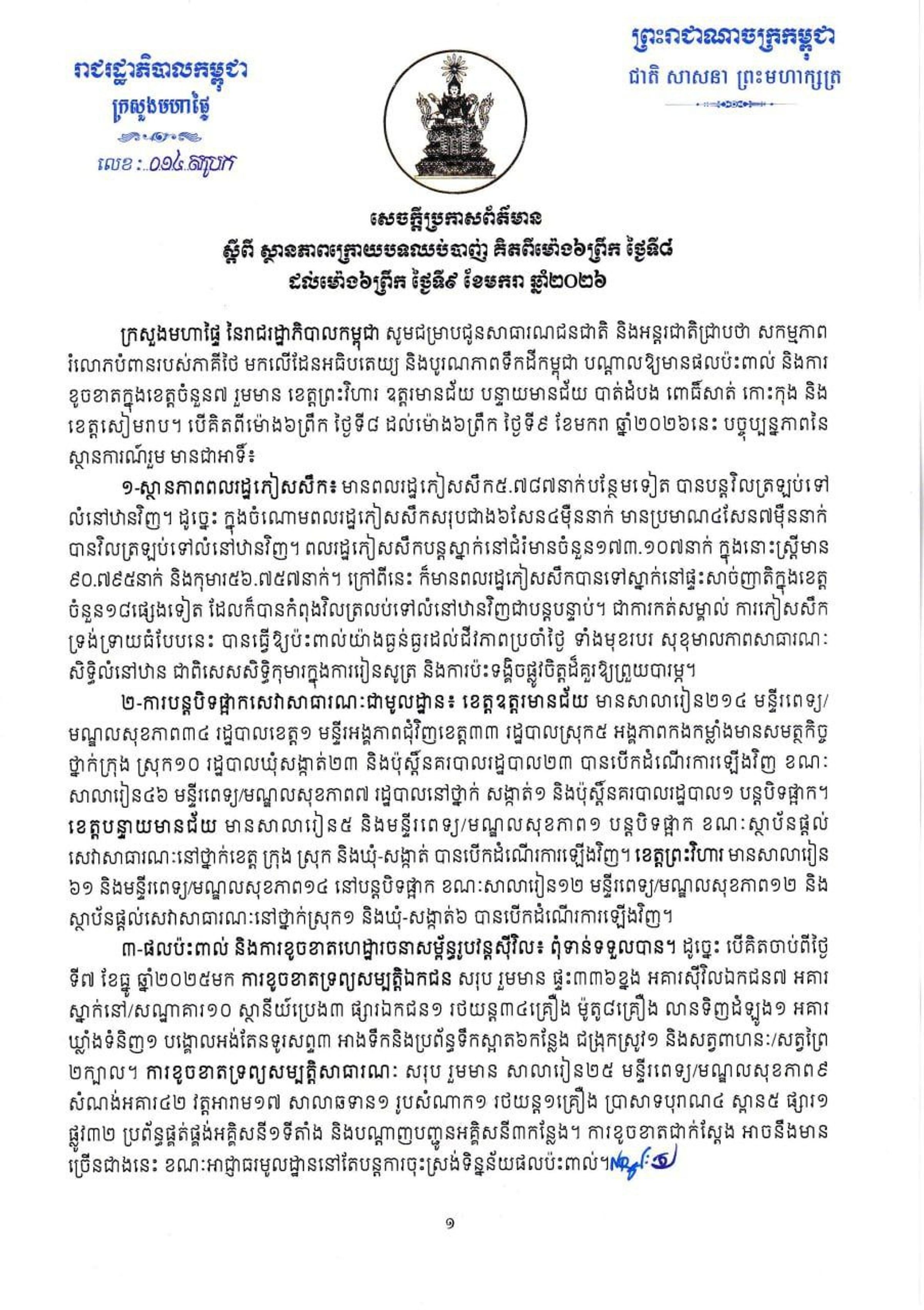 • សេចក្តីប្រកាសព័ត៌មាន៖ ស្ថានភាពក្រោយបទឈប់បាញ់ គិតពីម៉ោង៦ព្រឹក ថ្ងៃទី៨ ដល់ម៉ោង៦ព្រឹក ថ្ងៃទី៩ ខែមករា ឆ្នាំ២០២៦