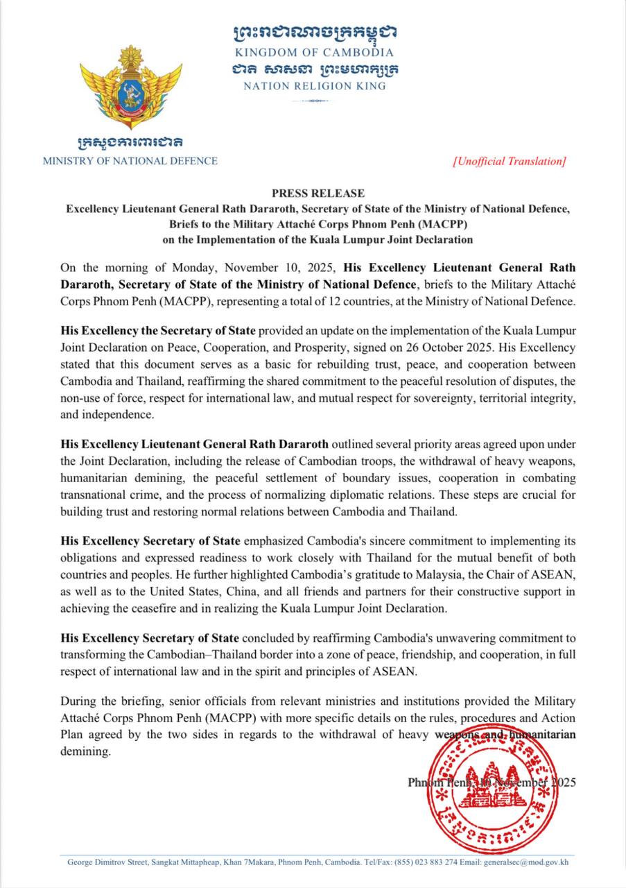• On 10 November 2025, the Ministry of Foreign Affairs and International Cooperation (MFAIC) issued a press release announcing that Cambodia’s Deputy Prime Minister and Minister of Foreign Affairs, His Excellency PRAK Sokhonn, will pay an official visit to Singapore from 12 to 13 November 2025. ...