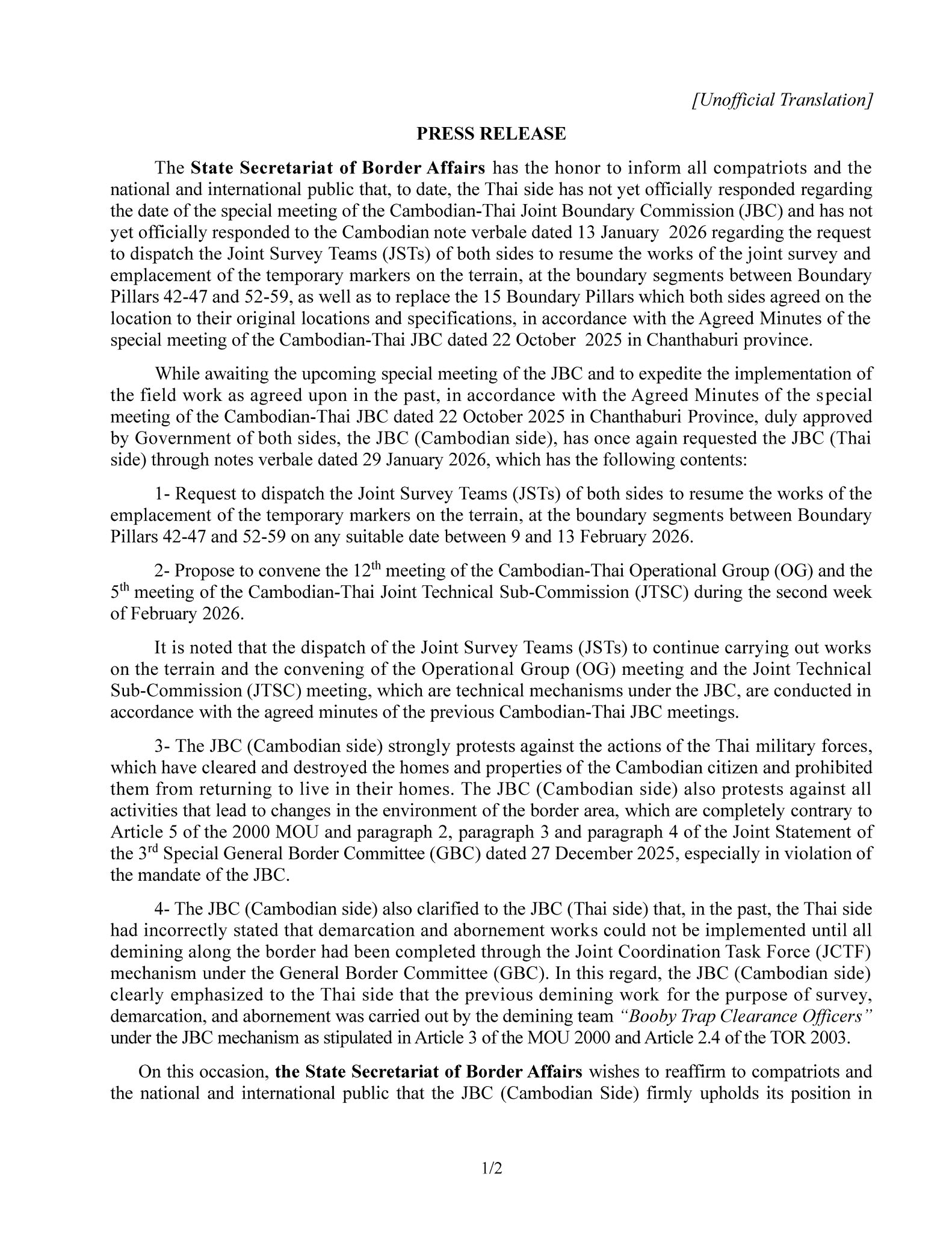 • On 31 January 2026, the State Secretariat of Border Affairs issued a press release on the meeting of the Cambodia-Thai Joint Border Commission (JBC).While awaiting the upcoming special meeting of the JBC and to expedite the implementation of the field work as agreed upon in ...