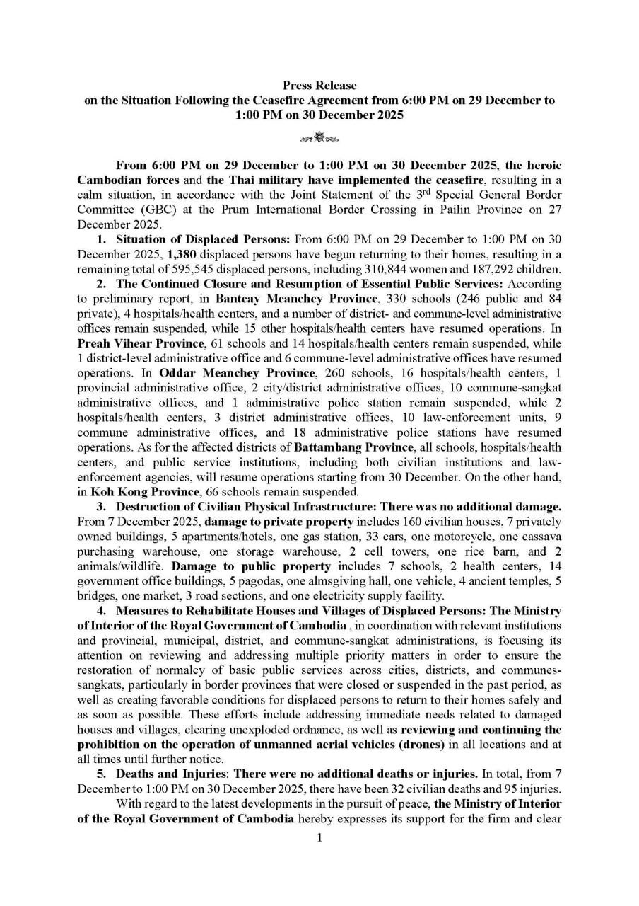 On 28 December 2025, the Ministry of Interior issued a press release regarding the situation following the ceasefire agreement from 1:00 PM to 6:00 PM on 28 December 2025.The heroic Cambodian forces and the Thai military have implemented the ceasefire, resulting in a calm situation, ...
