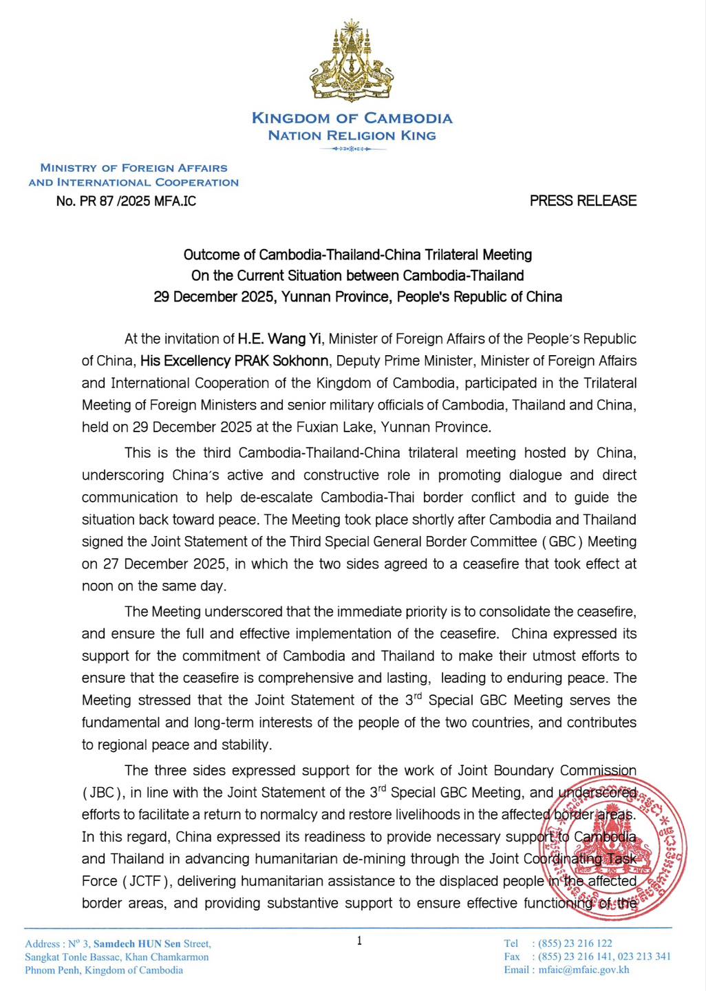 On 27 December 2025, the Ministry of Foreign Affairs and International Cooperation issued a press release regarding His Excellency Deputy Prime Minister PRAK Sokhonn to attend a trilateral meeting on the current situation between Cambodia and Thailand in Yunnan province, the People’s Republic of China.The ...