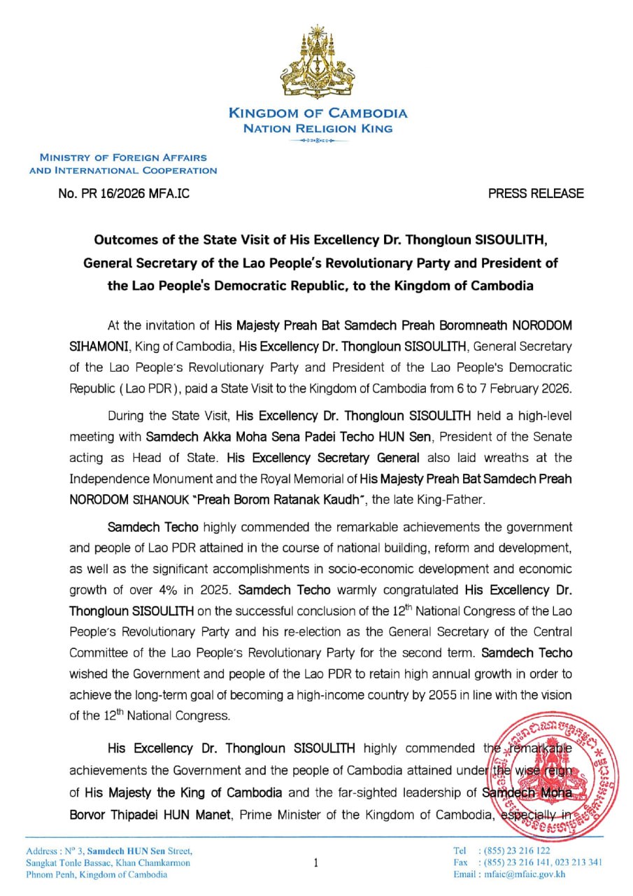 • នៅ​ថ្ងៃទី៤ ខែកុម្ភៈ​ ឆ្នាំ​២០២៦​ ក្រសួងការបរទេស និងសហប្រតិបត្តិការអន្តរជាតិ បានចេញសេចក្តីប្រកាសព័ត៌មាន ស្ដីពី​ នាយករដ្ឋមន្ត្រីនៃព្រះរាជាណាចក្រកម្ពុជាបានផ្ញើលិខិតមួយច្បាប់ជូនប្រធានាធិបតីនៃសាធារណរដ្ឋបារាំង។សម្តេចមហាបវរធិបតី ហ៊ុន ម៉ាណែត នាយករដ្ឋមន្ត្រីនៃព្រះរាជាណាចក្រកម្ពុជា បានផ្ញើលិខិតមួយច្បាប់ជូនឯកឧត្តម អេម៉ានុយអែល ម៉ាក្រុង ប្រធានាធិបតីនៃសាធារណរដ្ឋបារាំង ដើម្បីឆ្លើយតបទៅនឹងការបង្ហាញឆន្ទៈរបស់ប្រទេសបារាំងក្នុងការត្រៀមខ្លួនផ្តល់នូវឯកសារប្រវត្តិសាស្ត្រ និងបច្ចេកទេសពាក់ព័ន្ធនឹងព្រំដែនអន្តរជាតិរវាងប្រទេសកម្ពុជានិងប្រទេសថៃ។ ...