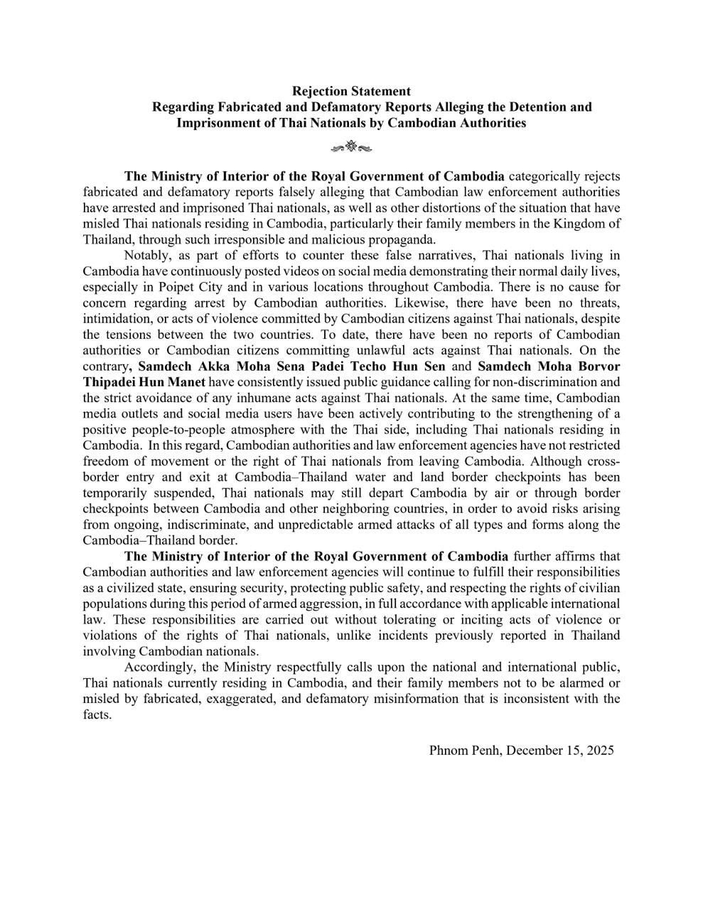 • The number of civilians killed by Thai attacks has risen to 12 after another citizen was killed on December 14, and the number of injured has reached at least 75, including 15 new injuries as of 6pm. Concurrently, the number of displaced peoples has increased ...