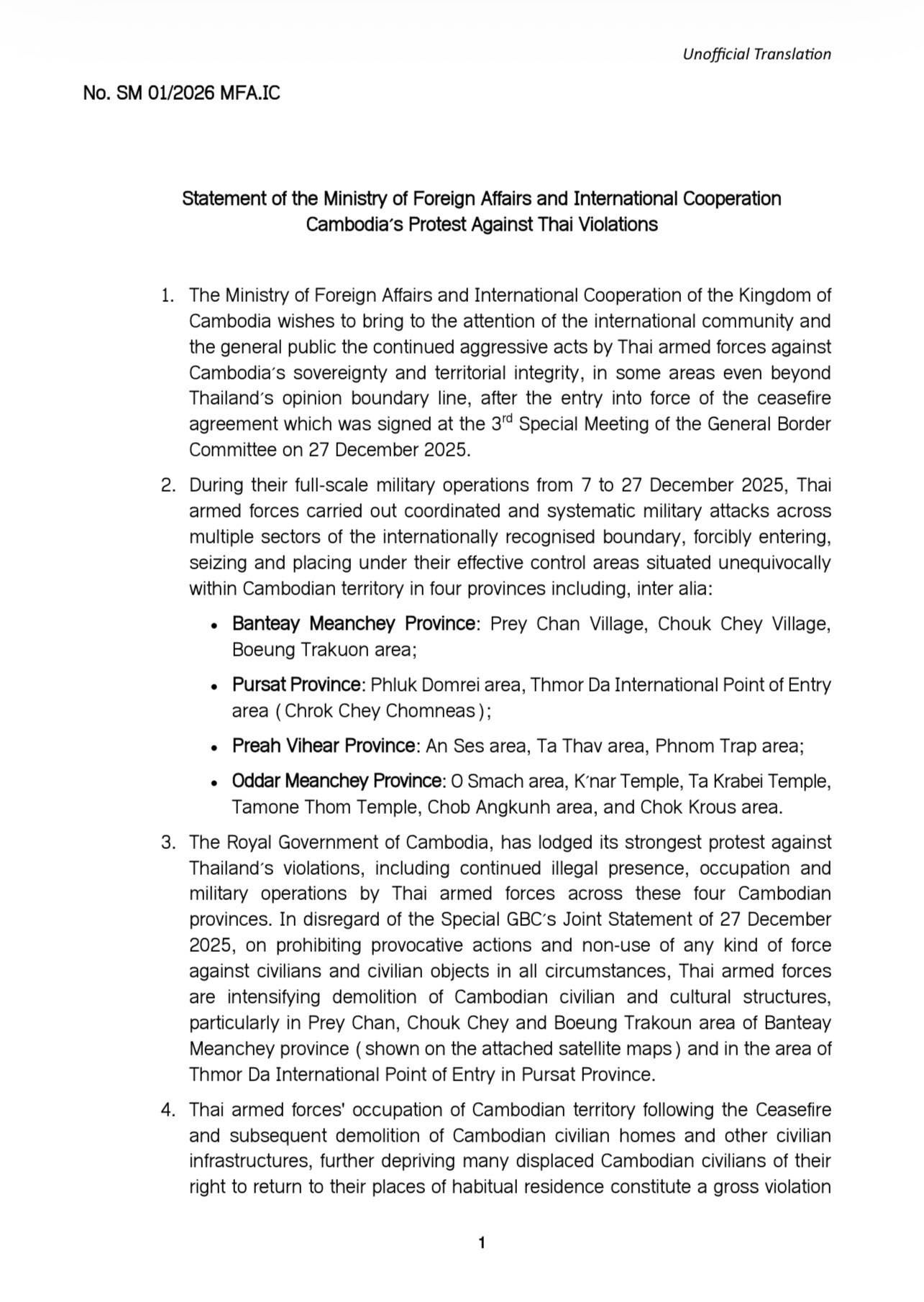 On 2 January 2026, the Ministry of Foreign Affairs and International Cooperation issued a statement on the protest of Cambodia against Thai violations. Cambodia hopes that the international community encourages Thailand settle the border disputes in accordance with international law and its obligations under the ...