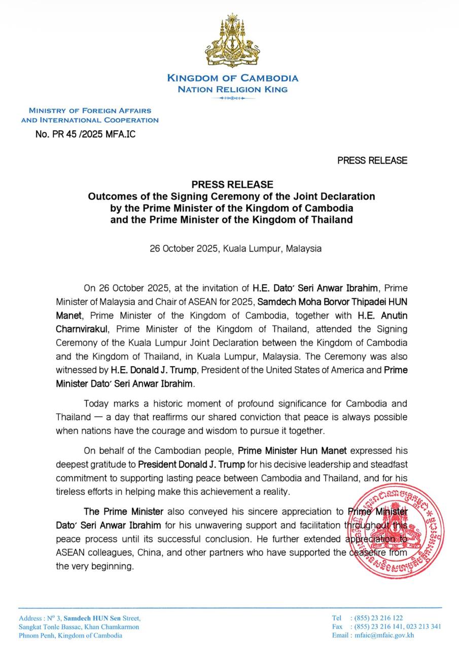 • The Cambodian Ministry of Foreign Affairs and International Cooperation (MFAIC) issued a press release detailing the signing of the Kuala Lumpur Joint Declaration between Prime Minister Hun Manet and Thai Prime Minister Anutin Charnvirakul on 26 October 2025.The ceremony was witnessed by President Donald J. ...