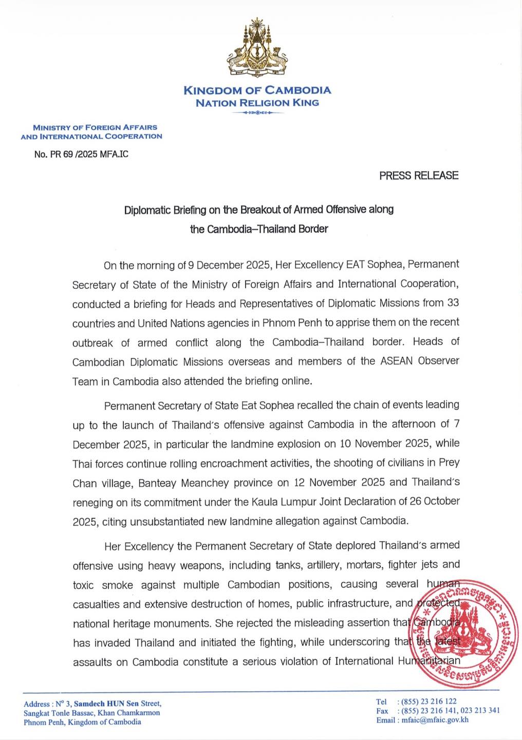 • On 9 December 2025, the Ministry of Culture and Fine Arts issued a statement solemnly condemning the destructive attacks carried out by the Thai military against Ta Krabey Temple, a sacred cultural site of Cambodia.The Ministry views this reprehensible act as reflecting profound immorality and ...