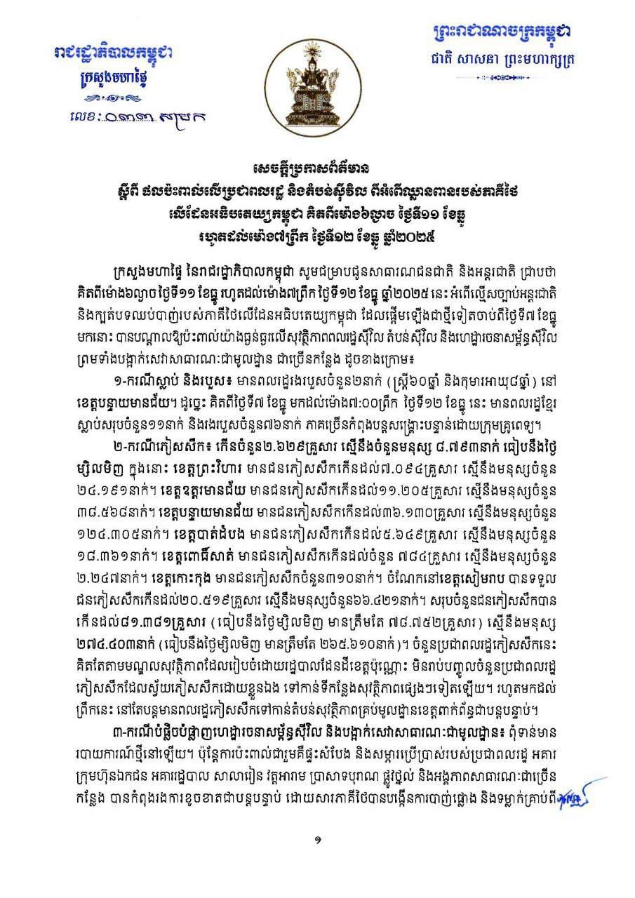 សេចក្តីប្រកាសព័ត៌មាន៖ ផលប៉ះពាល់លើប្រជាពលរដ្ឋ និងតំបន់ស៊ីវិល ពីអំពើឈ្លានពានរបស់ភាគីថៃ លើដែនអធិបតេយ្យកម្ពុជា គិតពីម៉ោង៦ល្ងាច ថ្ងៃទី១១ ខែធ្នូ រហូតដល់ម៉ោង៧ព្រឹក ថ្ងៃទី១២ ខែធ្នូ ឆ្នាំ២០២៥
