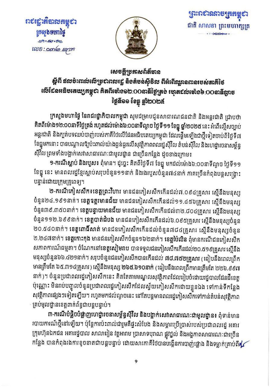 នៅថ្ងៃទី១១ ខែធ្នូ ឆ្នាំ២០២៥ ក្រសួងមហាផ្ទៃ បានចេញសេចក្តីថ្លែងការណ៍រៀបរាប់ពីផលប៉ះពាល់ធ្ងន់ធ្ងរនៃការឈ្លានពានរបស់យោធាថៃ ដោយបញ្ជាក់ថា ចំនួនជនស៊ីវិលស្លាប់សរុបគិតចាប់ពីថ្ងៃទី៧ ខែធ្នូ គឺ ១១នាក់ និងរងរបួស ៧៤ ...