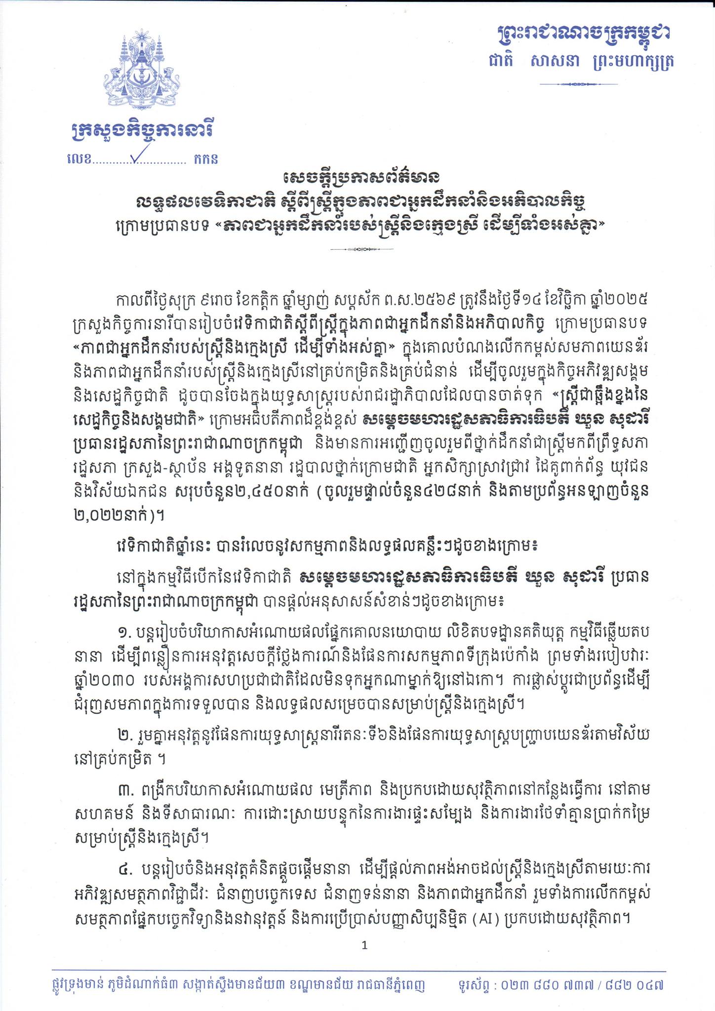 • On 18 November 2025, the Ministry of Environment issued an announcement on the celebration of the National Environmental Sanitation Day under the theme “Clean Habits, Clean Families, Good Environment” on 23 November 2025. This day is organized to raise awareness, take care of the environment, ...