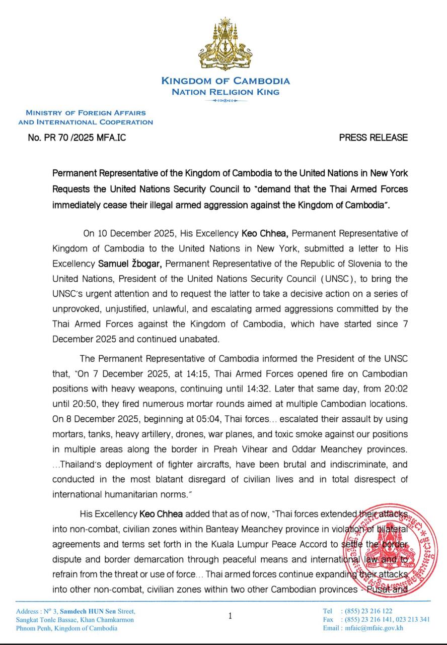 On 10 December 2025, the Ministry of Interior issued a press release informing the national and international community that Thailand’s violations of international law and breaches of the ceasefire against Cambodia’s sovereign territory have caused severe impacts on civilian safety, destruction of infrastructure, pagodas, cultural ...