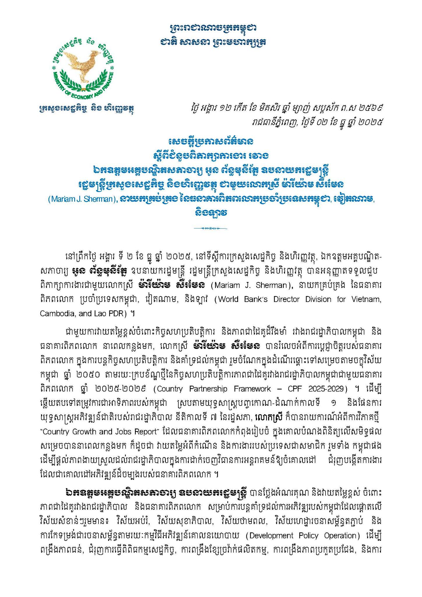On 2 December 2025, the Ministry of Economy and Finance issued an announcement on the meeting between H.E. Dr. Aun Pornmoniroth, Deputy Prime Minister and Minister of Economy and Finance, and Ms. Mariam Sherman, World Bank’s Director Division for Vietnam, Cambodia, and Lao PDR.Meanwhile, in the ...