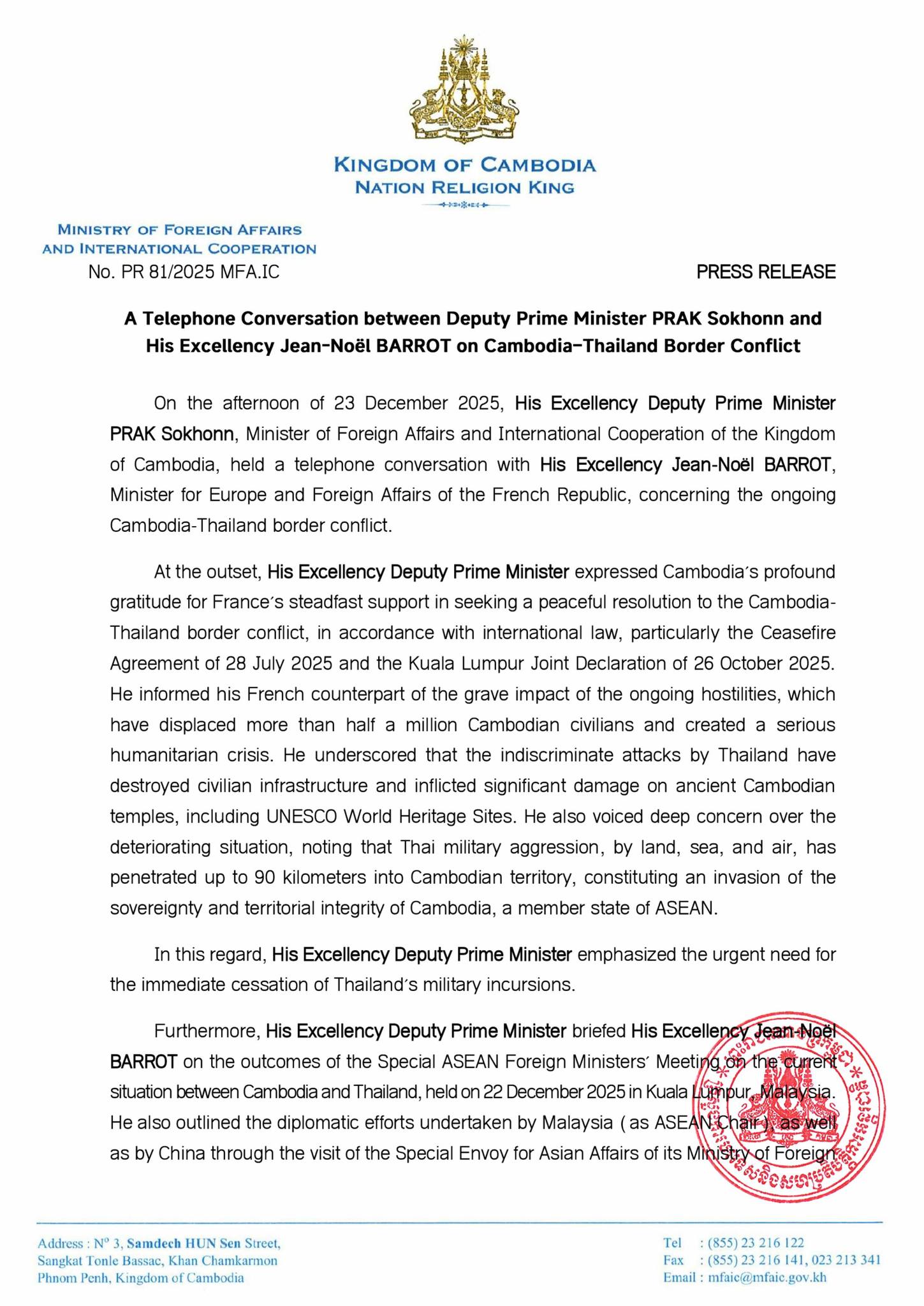 • Cambodian Minister of Environment Eang Sophalleth has described Thailand’s aggressive incursions into Cambodian territory through aerial bombardment, artillery shelling and the use of toxic smoke as violations of international law that have destroyed natural resources, actions that should be considered “environmental crime”. ...