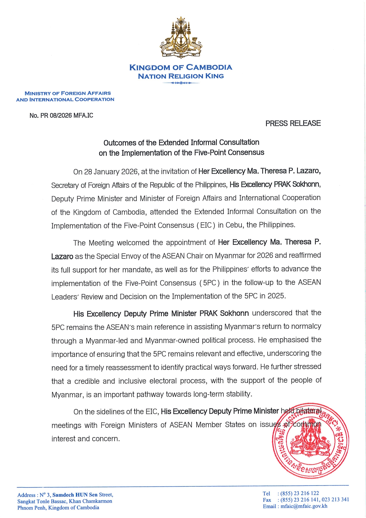 On 29 January 2026, the Ministry of Foreign Affairs and International Cooperation issued a press release regarding the outcomes of the extended informal consultation on the implementation of the five-point consensus.His Excellency PRAK Sokhonn, Deputy Prime Minister and Minister of Foreign Affairs and International Cooperation ...