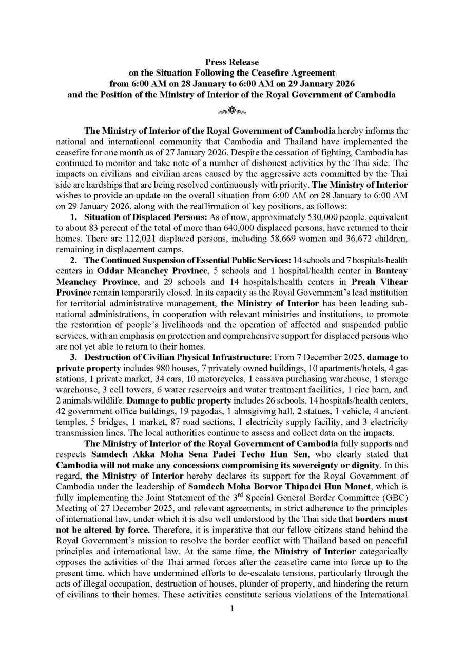 On 29 January 2026, the Ministry of Interior issued a press release on the situation following the ceasefire agreement from 6:00 AM on 28 January to 6:00 AM on 29 January 2026 and the position of the Ministry of Interior of the Royal Government of ...