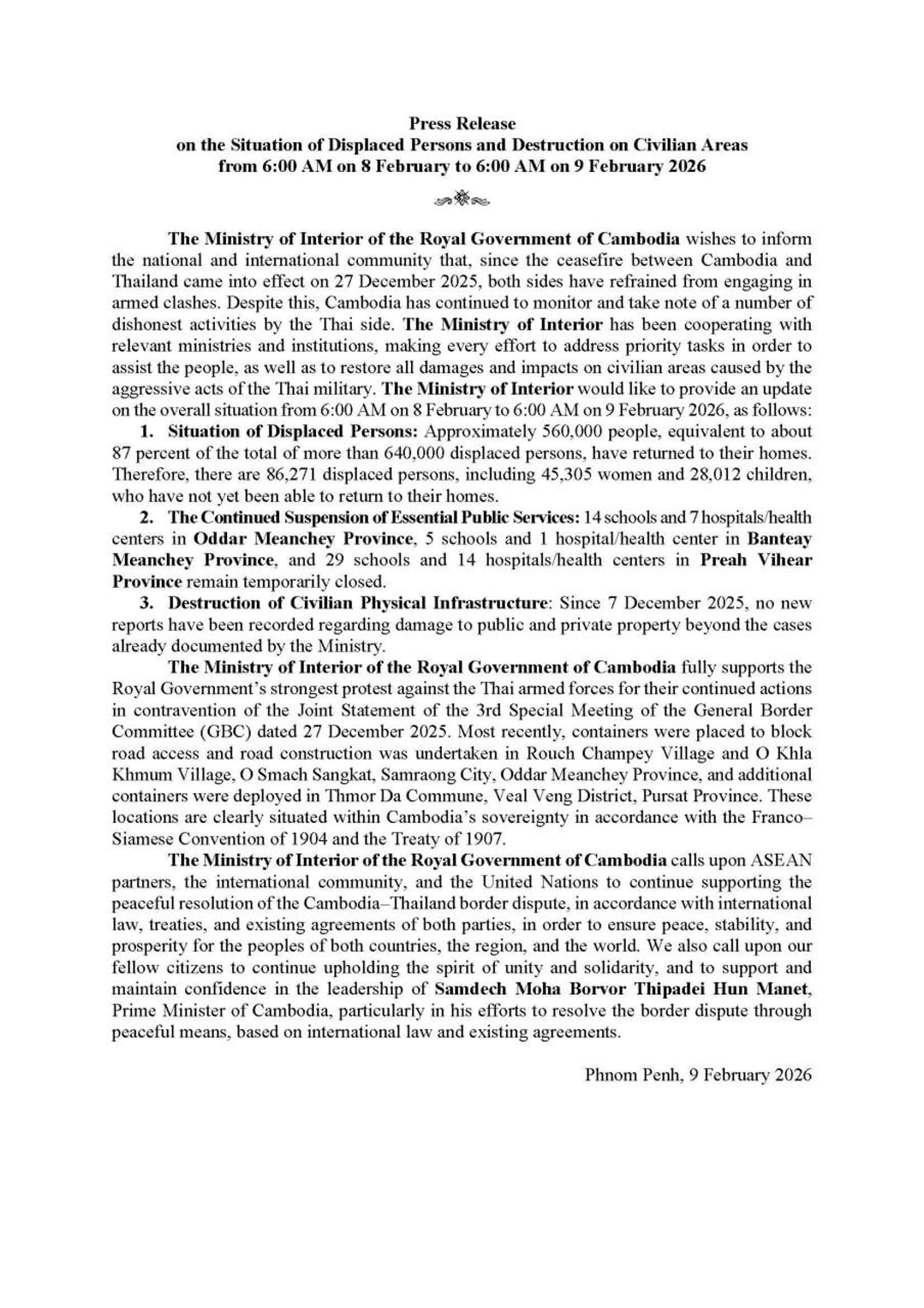 On 8 February 2026, the Ministry of Foreign Affairs and International Cooperation issued a press release on Cambodia’s protest against Thai military’s activities in occupied Cambodian territory.The Ministry of Foreign Affairs and International Cooperation has formally registered Cambodia’s strongest protest against the illegal activities conducted ...