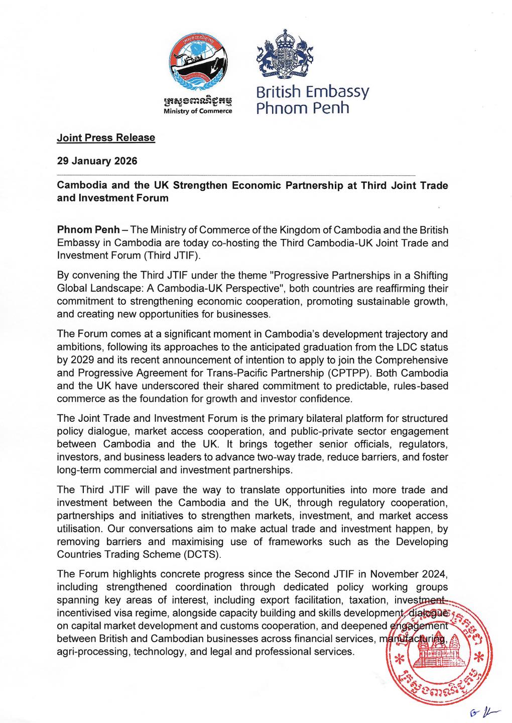 On 29 January 2026, the Ministry of Commerce and British Embassy in Cambodia issued a joint press release regarding the organization of the third Cambodia-UK Joint Trade and Investment Forum (Third JTIF).By convening the Third JTIF under the theme “Progressive Partnerships in a Shifting Global ...