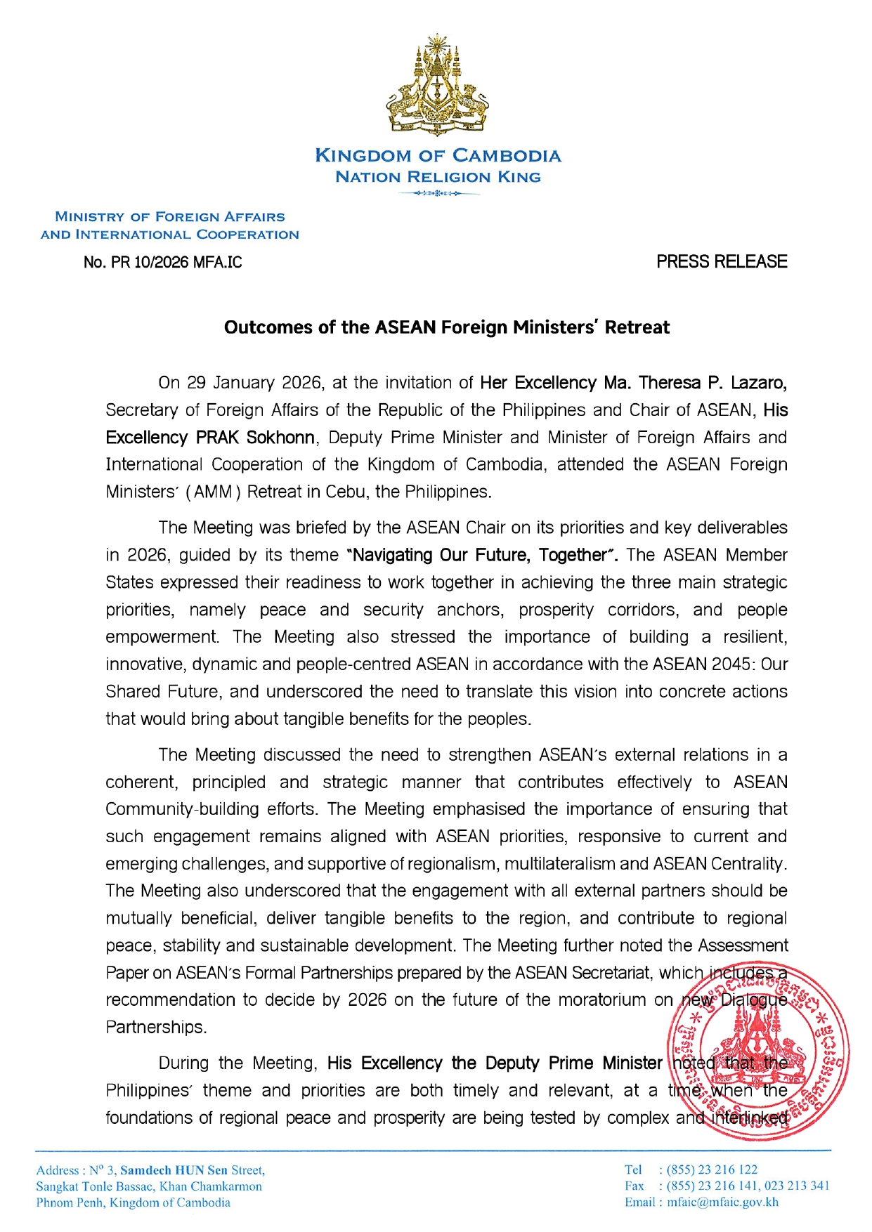 On 29 January 2026, the Ministry of Foreign Affairs and International Cooperation issued a press release regarding the outcomes of the extended informal consultation on the implementation of the five-point consensus.His Excellency PRAK Sokhonn, Deputy Prime Minister and Minister of Foreign Affairs and International Cooperation ...
