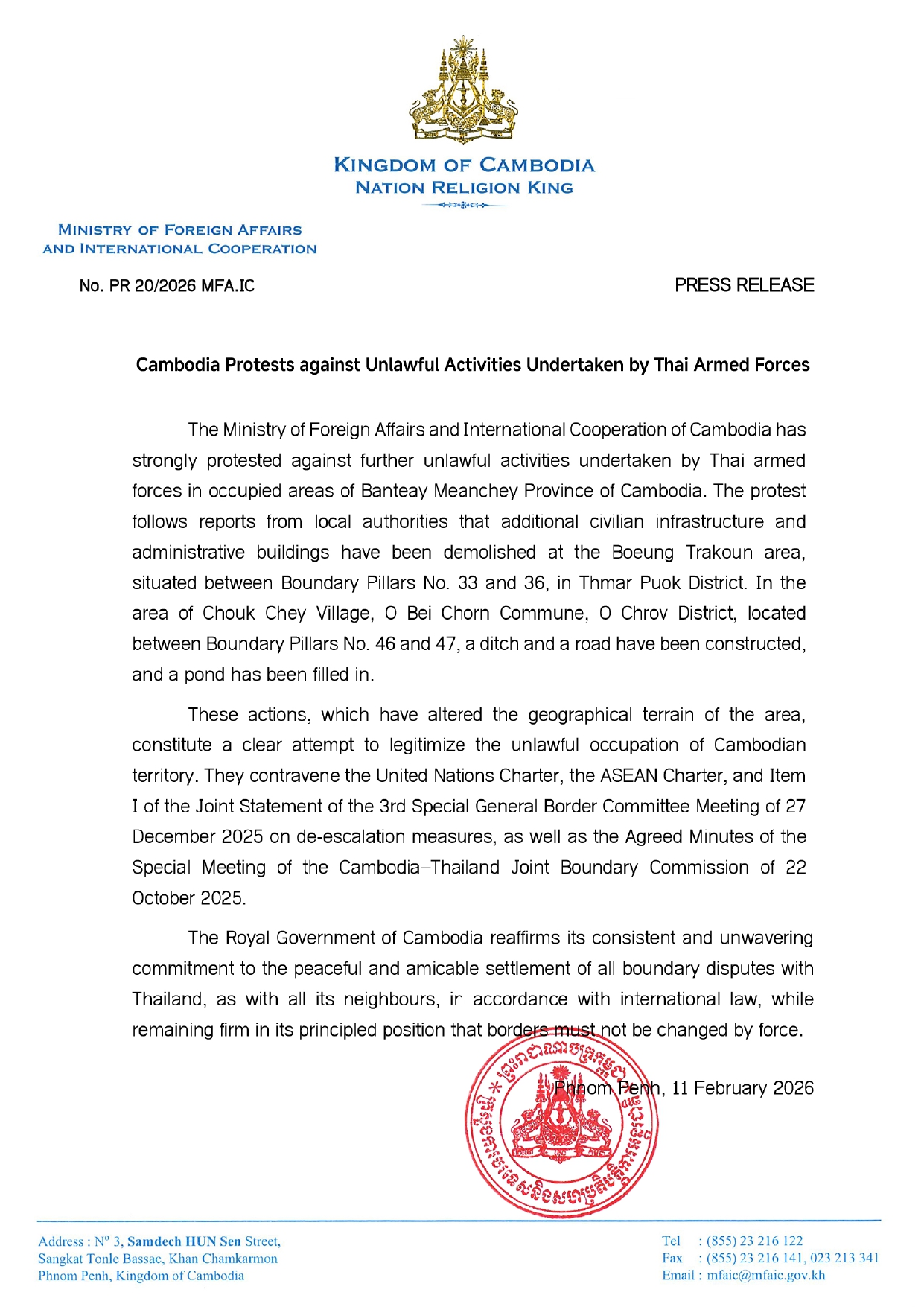 • On 11 February 2026, the Ministry of Foreign Affairs and International Cooperation issued a press release on Cambodia’s protest against unlawful activities undertaken by the Thai armed forces.The Ministry of Foreign Affairs and International Cooperation of Cambodia has strongly protested against further unlawful activities undertaken ...