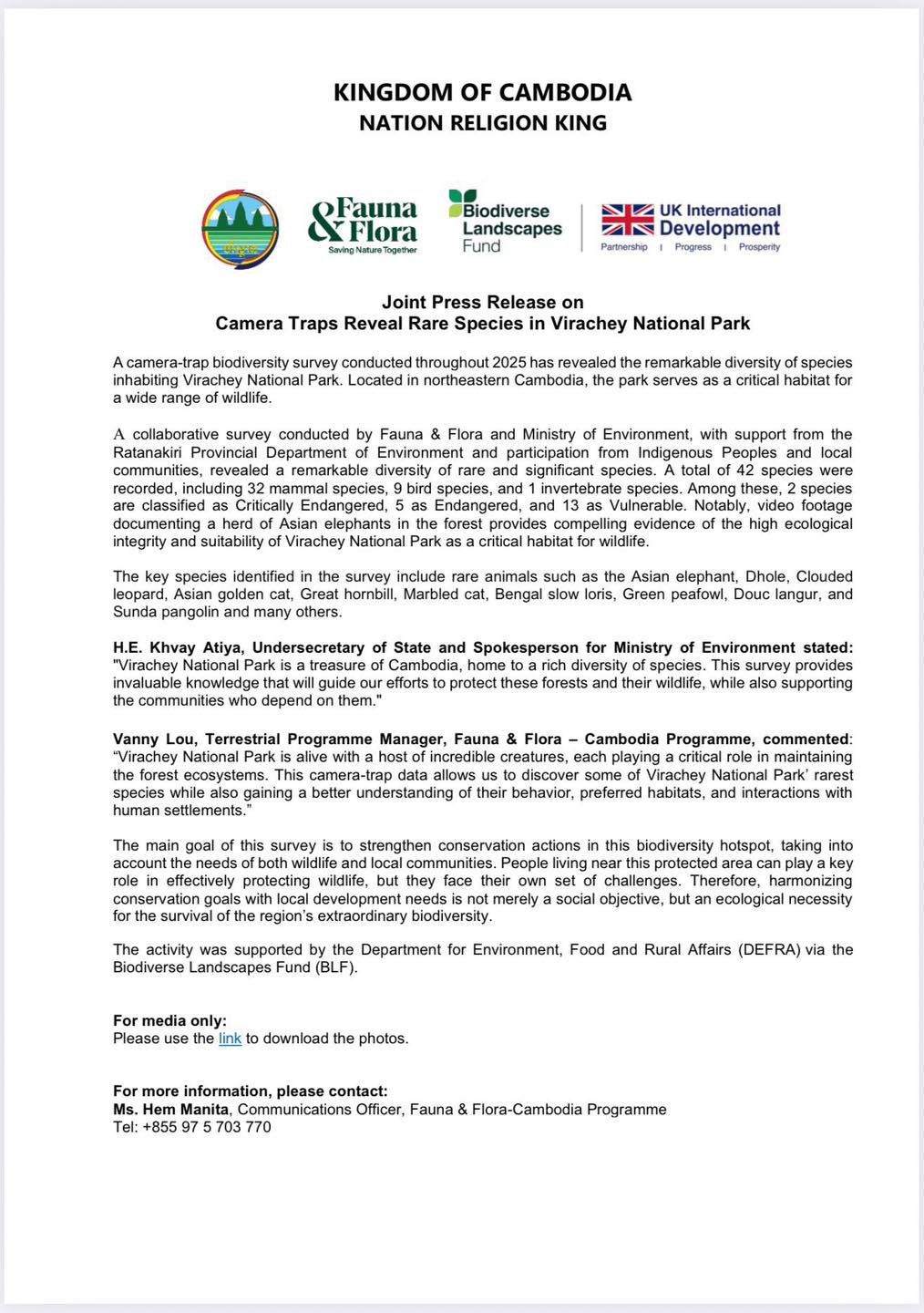 • On 11 February 2026, Fauna & Flora and Ministry of Environment issued a joint press release on camera traps revealing rare species in Virachey National Park.A camera-trap biodiversity survey conducted throughout 2025 has revealed the remarkable diversity of species inhabiting Virachey National Park. ...