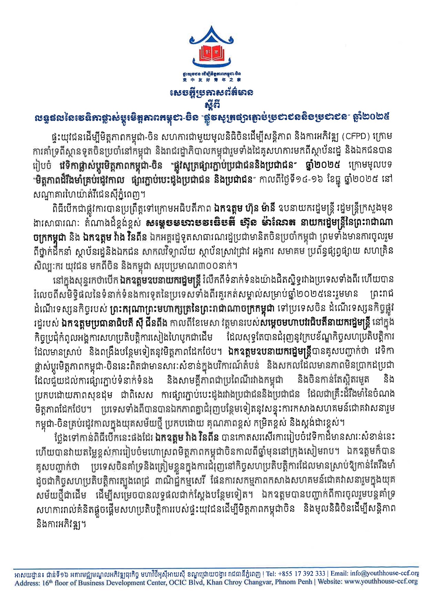 On 17 December 2025, the Youth House for Cambodia-China Friendship (YHCCF) issued a statement summarizing the results of the Cambodia-China Friendship Exchange Forum “Silk Road Connecting People and People” 2025, held from 14 to 16 December in Phnom Penh.The forum brought together over 400 representatives ...