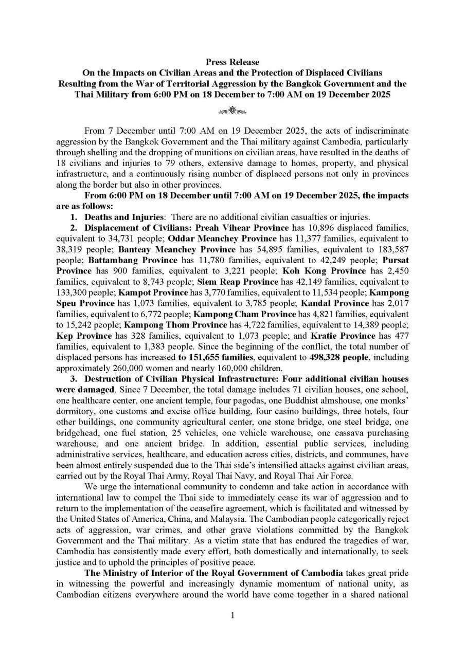 On 19 December 2025, the Ministry of Interior issued a press release reporting the impacts on civilian areas and the protection of displaced civilians resulting from the war of territorial aggression by the Bangkok government and the Thai military from 6:00 PM on 18 December ...