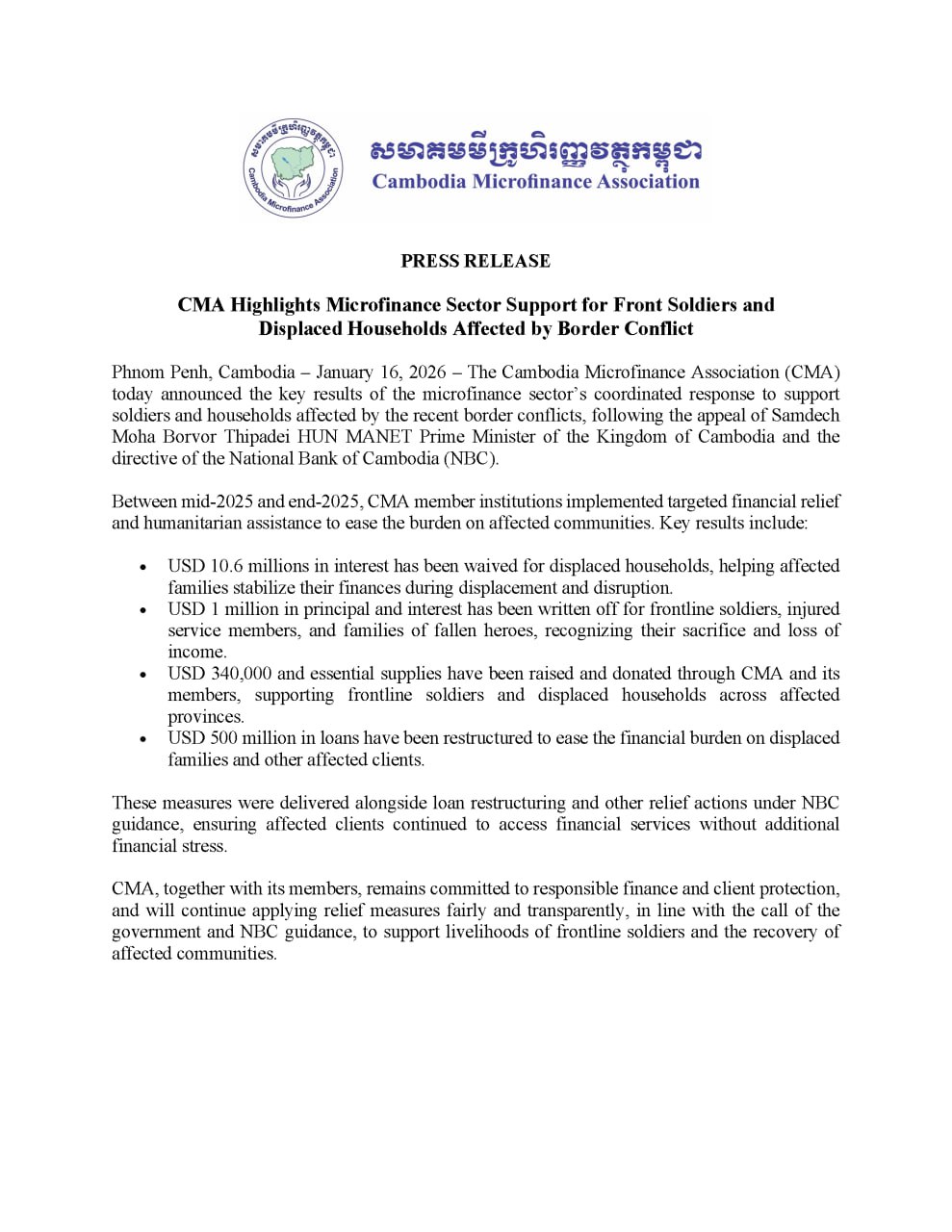 នៅថ្ងៃទី១៦ ខែមករា ឆ្នាំ២០២៦ សមាគមមីក្រូហិរញ្ញវត្ថុកម្ពុជា បានចេញសេចក្ដីប្រកាសព័ត៌មាន ស្ដីពី ការគាំទ្ររបស់វិស័យមីក្រូហិរញ្ញវត្ថុដល់កងទ័ពជួរមុខ និងជនភៀសសឹកដោយសារជម្លោះព្រំដែន។ក្នុងរយៈពេលចន្លោះពីពាក់កណ្ដាលដល់ដំណាច់ឆ្នាំ២០២៥ គ្រឹះស្ថានជាសមាជិករបស់សមាគម មីក្រូហិរញ្ញវត្ថុកម្ពុជា បានអនុវត្តវិធានការបន្ធូរបន្ថយផ្នែកហិរញ្ញវត្ថុ និងជំនួយមនុស្សធម៌ផ្សេងៗ ដើម្បីជួយសម្រាលបន្ទុកដល់សហគមន៍ដែលរងគ្រោះ។ ...