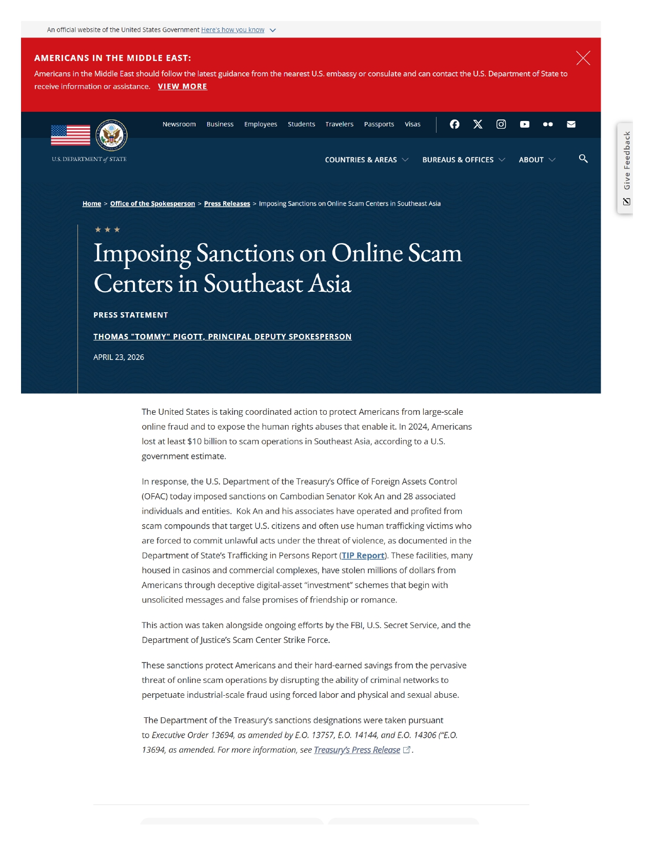 On 23 April 2026, U.S Department of State issued a press statement on imposing sanctions on online scam centers in Southeast Asia.In response, the U.S. Department of the Treasury’s Office of Foreign Assets Control (OFAC) today imposed sanctions on Cambodian Senator Kok An and 28 ...