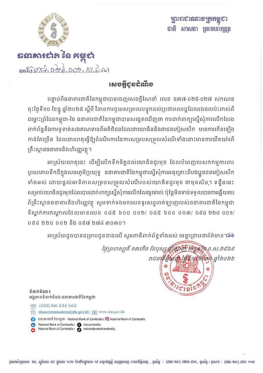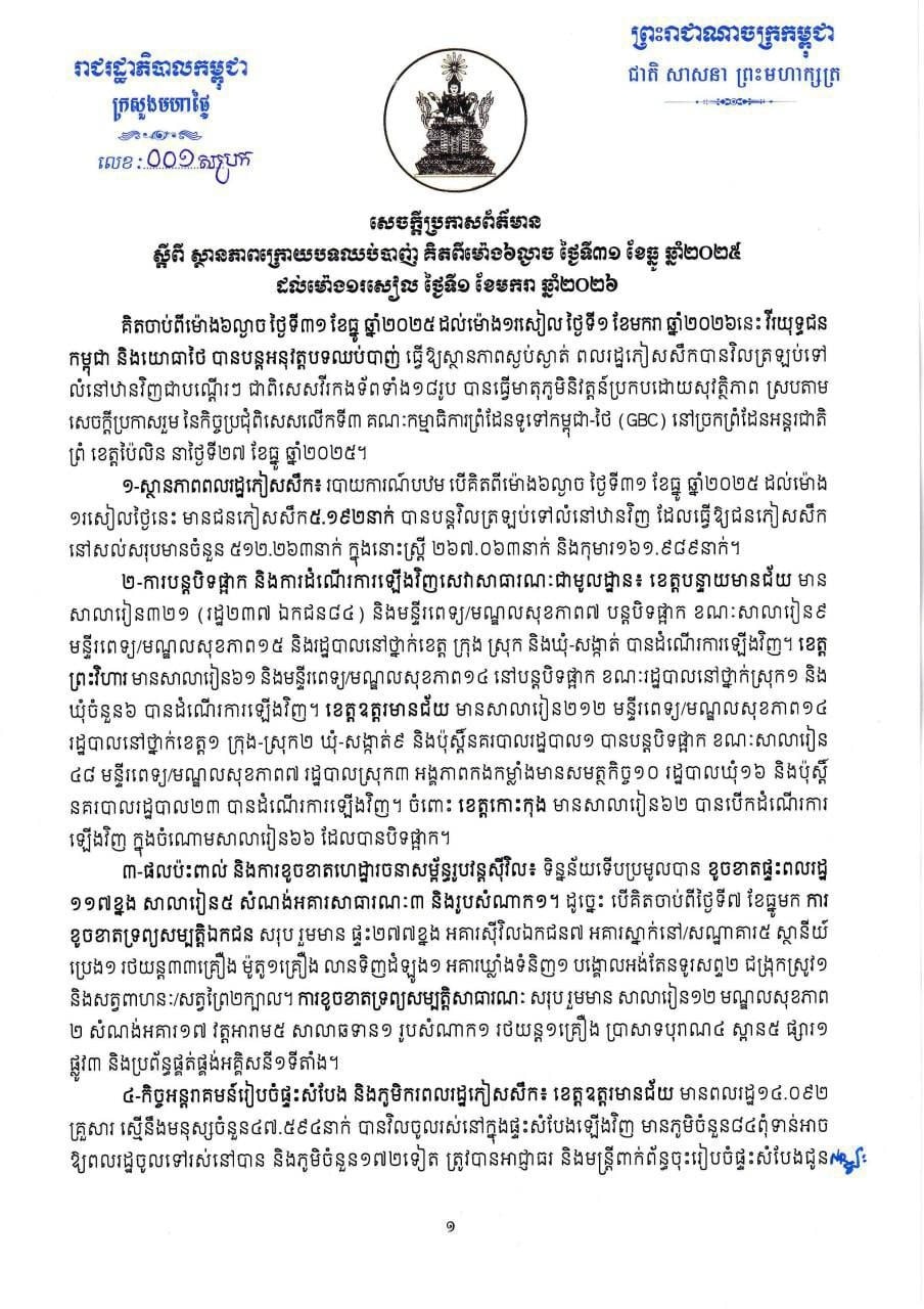 • នៅថ្ងៃទី៣១ ខែធ្នូ ឆ្នាំ២០២៥ អាជ្ញាធរកម្ពុជាគ្រប់គ្រងសក​ម្មភាពកំចាត់មីន និងសង្រ្គោះជនពិការដោយសារមីន បានចេញសេចក្តី​ណែនាំ​ ស្តីពី ​វិធានការ​បន្ទាន់​ក្នុង​ការ​អប់រំ​ផ្សព្វផ្សាយ​ការ​យល់ដឹង​ពី​គ្រោះថ្នាក់​ដោយសារ​យុទ្ធភណ្ឌ​គ្រឿង​ផ្ទុះ។ដើម្បីបង្ការនិងទប់ស្កាត់គ្រោះថ្នាក់ដែលអាចកើតមានជាយថាហេតុ អាជ្ញាធរកម្ពុជាគ្រប់គ្រងសក​ម្មភាពកំចាត់មីន និងសង្រ្គោះជនពិការដោយសារមីន (អាជ្ញាធរមីន) សូមធ្វើការណែនាំដល់ភាគីពាក់ព័ន្ធទាំងអស់ឱ្យ អនុវត្តនូវវិធានការដូចចែងក្នុងសេចក្ដីណែនាំខាងលើ។ ...