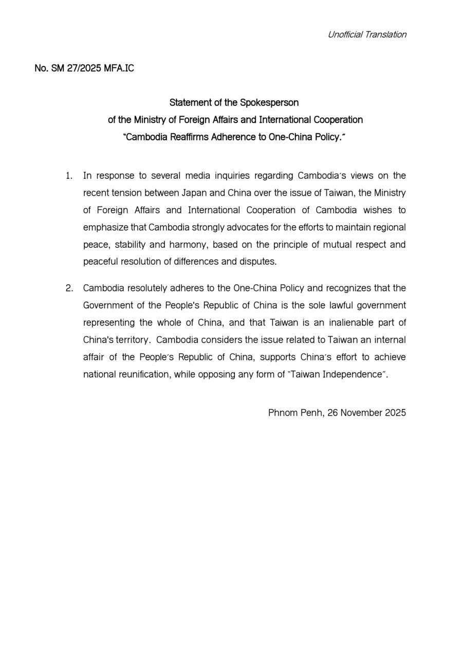 • On 26 November 2025, the Ministry of Foreign Affairs and International Cooperation issued a statement on adherence to the One-China Policy. Cambodia resolutely adheres to the One-China Policy and recognizes that the Government of the People’s Republic of China is the sole lawful government representing ...