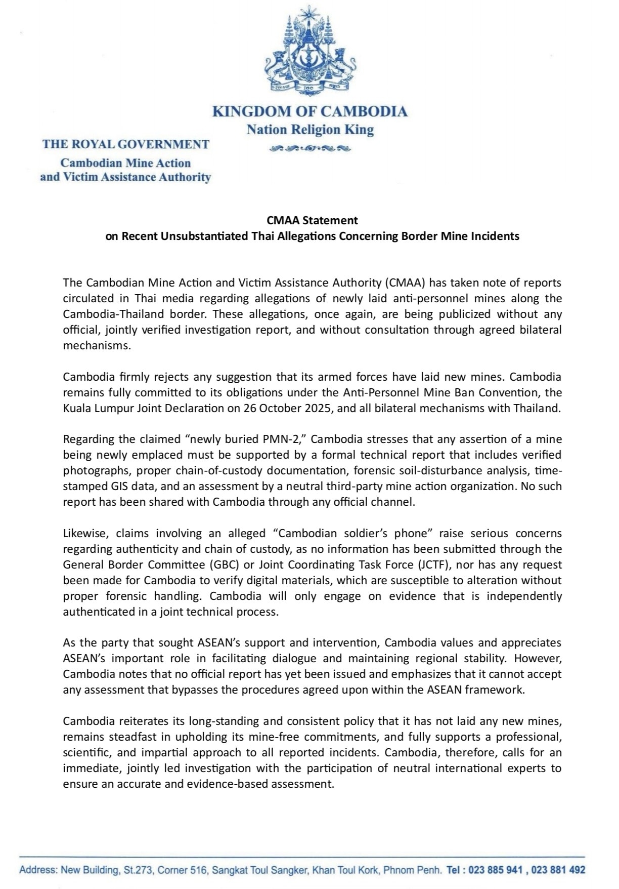 On 25 November 2025, the Cambodian Mine Action and Victim Assistance Authority (CMAA) issued a statement firmly rejecting recent unsubstantiated allegations in the Thai media regarding newly laid mines, emphasizing that no official joint verification or technical evidence has been presented through the agreed-upon bilateral ...