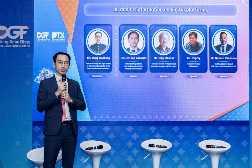 It is against this backdrop that the panel discussion on “AI and Disinformation on digital platforms” took place. Moderated by Mr. Taing Bunhong, Director of the Department of Policy and Legal Affairs at the General Secretariat of the Digital Government Committee, the session featured H.E. Mr. Tep Asnarith, Undersecretary of State and Spokesperson for the Ministry of Information, Mr. Toby Mendel, Executive Director of the Center of Law and Democracy, UNESCO Expert, Mr. Nop Vy, Executive Director of CamboJA, and Mr. Naveen Vasudeva, Founder of Strategic Capital Risk Expert, CyberTree Paradox LTD. Jointly, they shared insights on how AI-driven falsehoods are affecting societies, journalists, and institutions, as well as the steps needed to mitigate these risks.