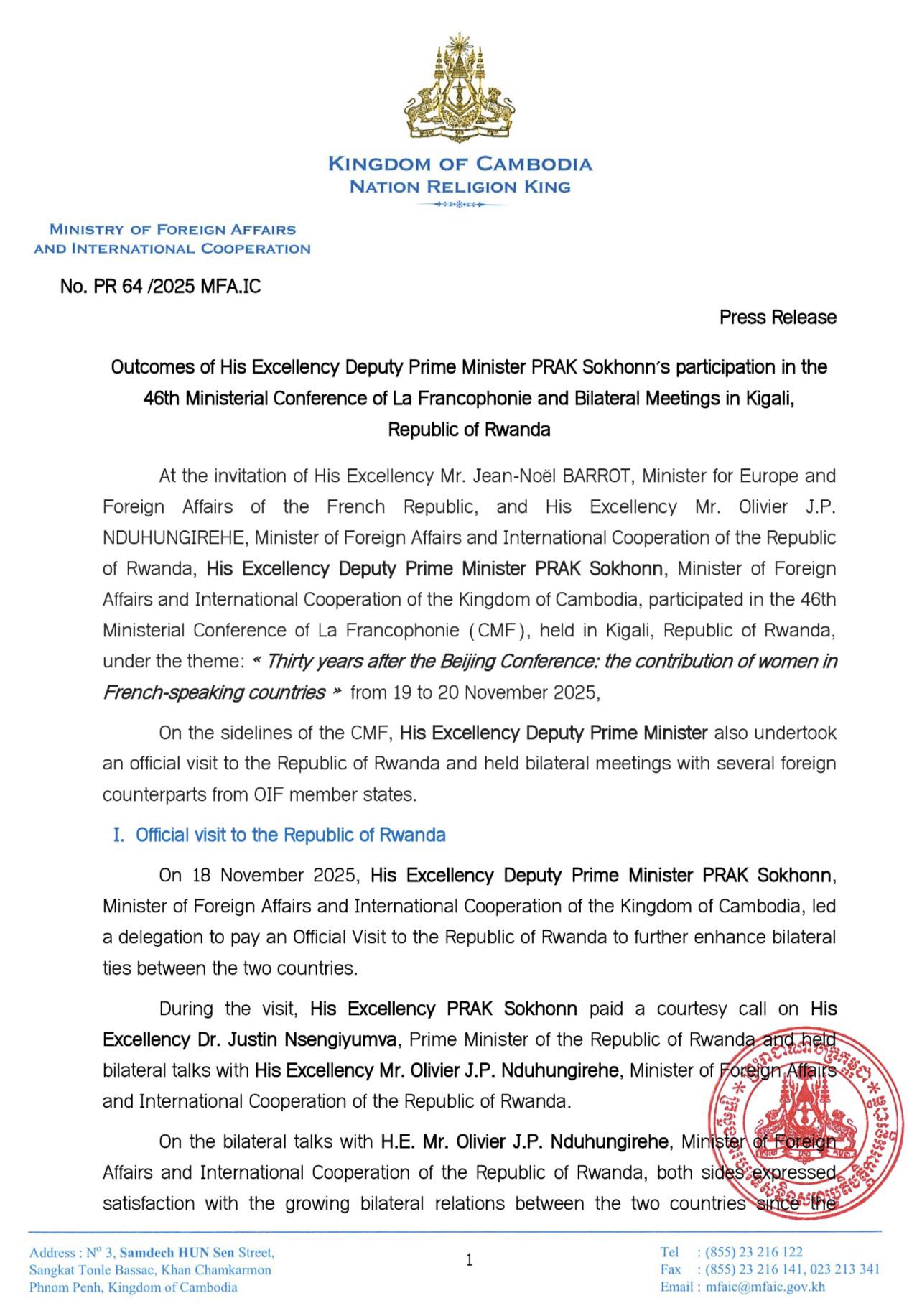 On 28 November 2025, the Ministry of Foreign Affairs and International Cooperation issued a press release on the outcomes of His Excellency Deputy Prime Minister PRAK Sokhonn’s participation in the 46th Ministerial Conference of La Francophonie and Bilateral Meetings in Kigali, Republic of Rwanda.On the ...