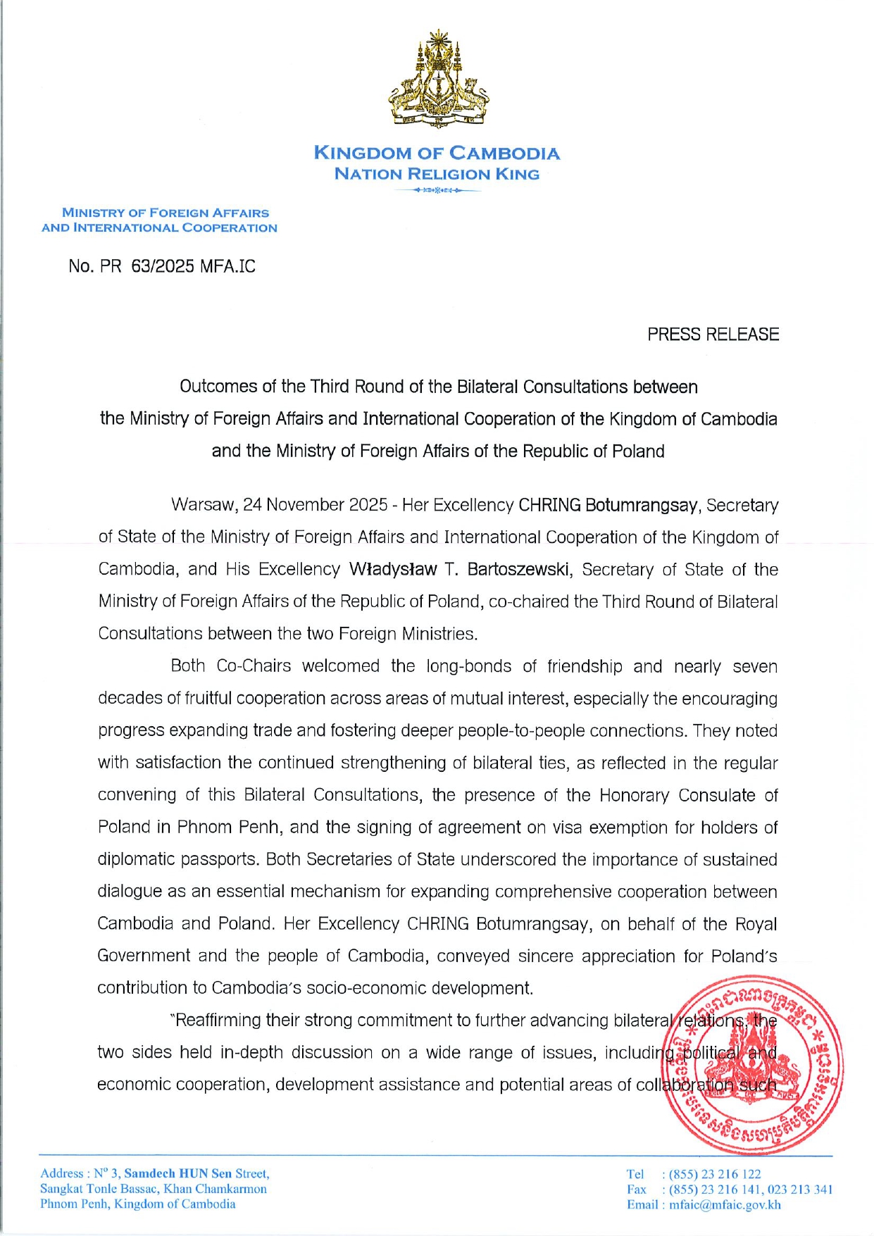 On 28 November 2025, the Ministry of Foreign Affairs and International Cooperation issued a press release on the outcomes of the third round of bilateral consultations between the Kingdom of Cambodia’s Ministry of Foreign Affairs and International Cooperation and the Republic of Poland’s Ministry of ...