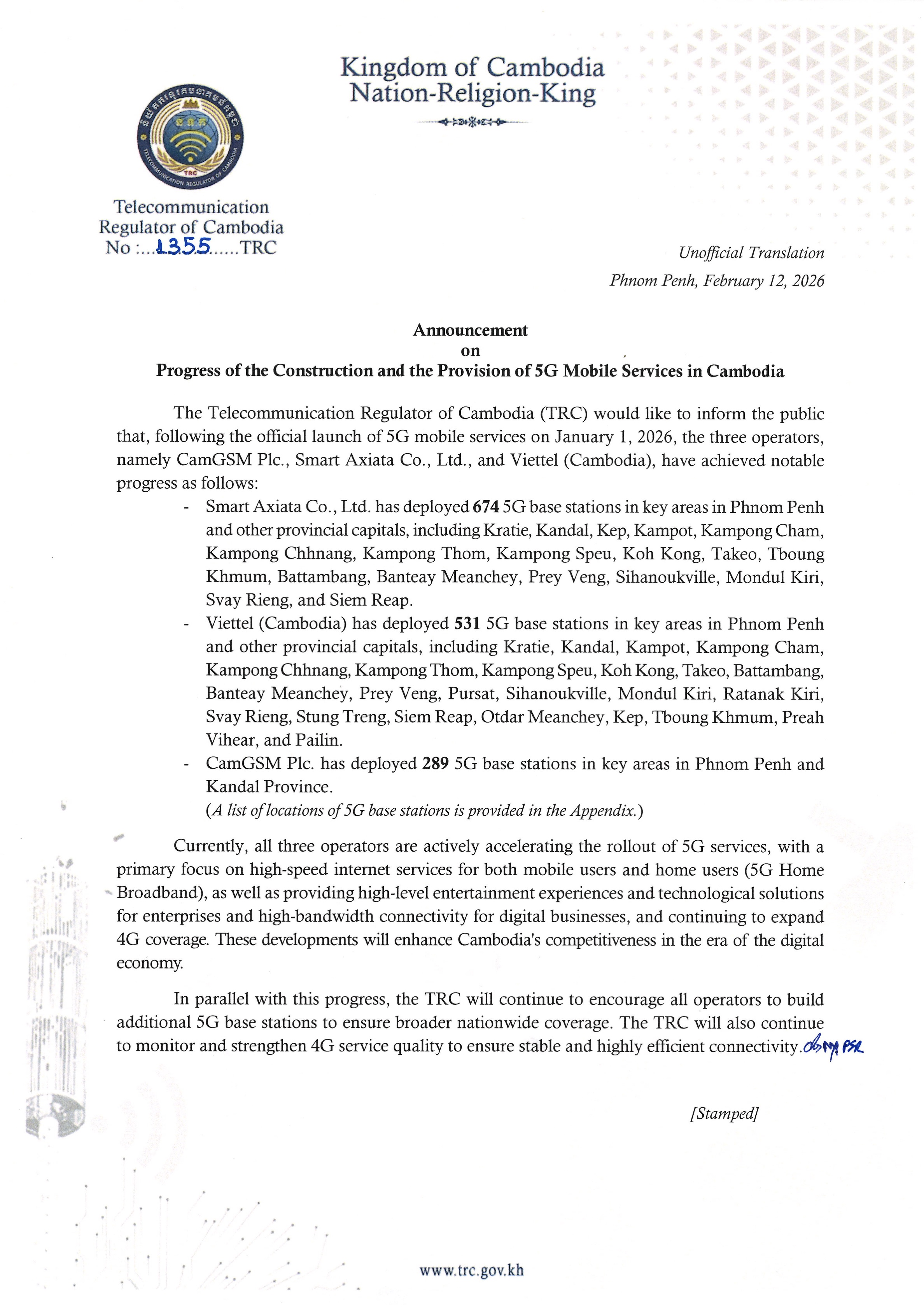 On 12 February 2026,  the Telecommunication Regulator of Cambodia issued an announcement on the progress of the construction and the provision of 5G mobile services in Cambodia.