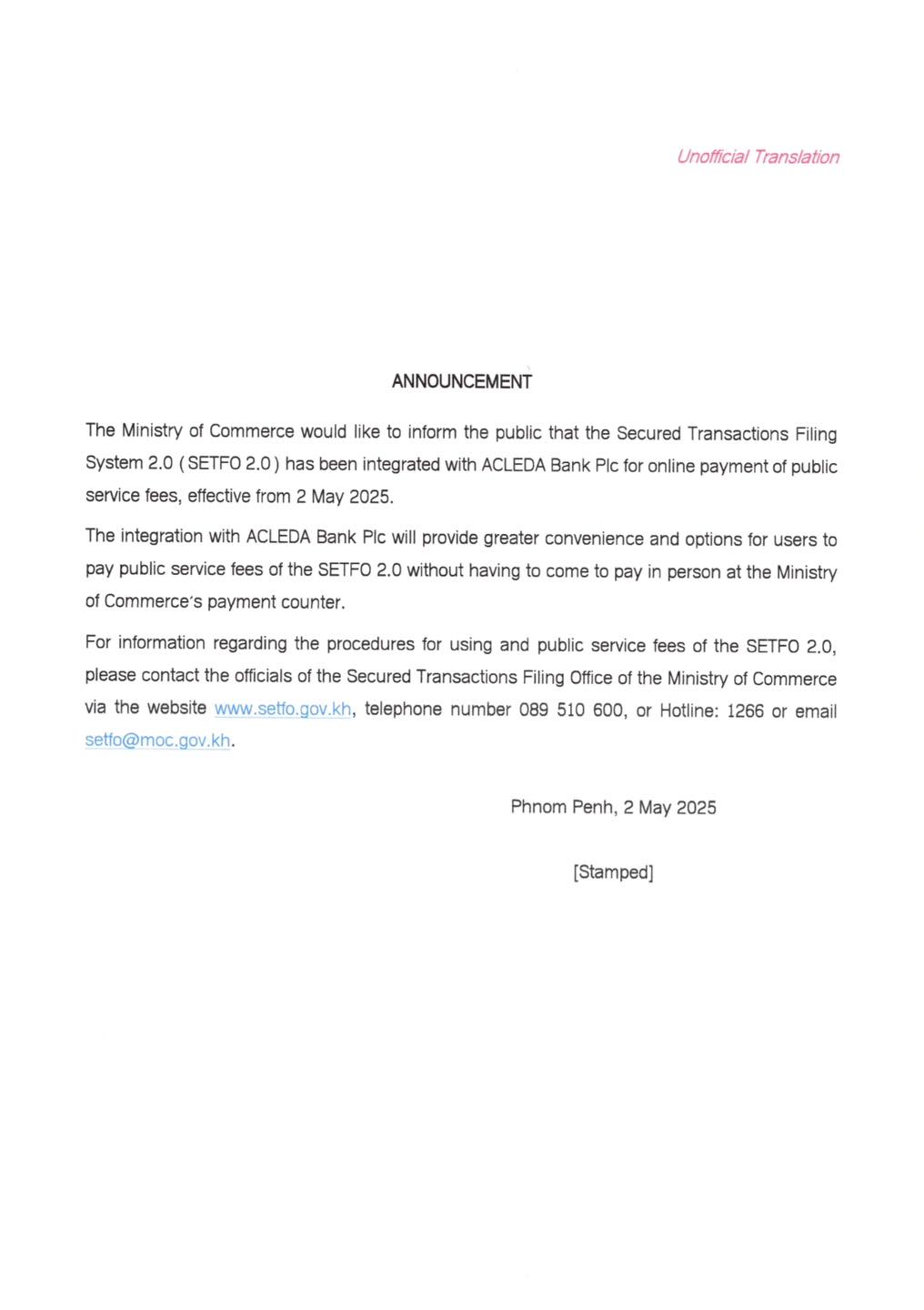 ប្រព័ន្ធតម្កល់លិខិតជូនដំណឹងនៃប្រតិបត្តិការដែលមានកិច្ចធានាកំណែ ២.០ ត្រូវបានភ្ជាប់ជាមួយនឹងធនាគារអេស៊ីលីដា ភីអិលស៊ី សម្រាប់ការទូទាត់កម្រៃសេវាសាធារណៈតាមប្រព័ន្ធអនឡាញ ចាប់ពីថ្ងៃទី២ ខែឧសភា ឆ្នាំ២០២៥ តទៅ។