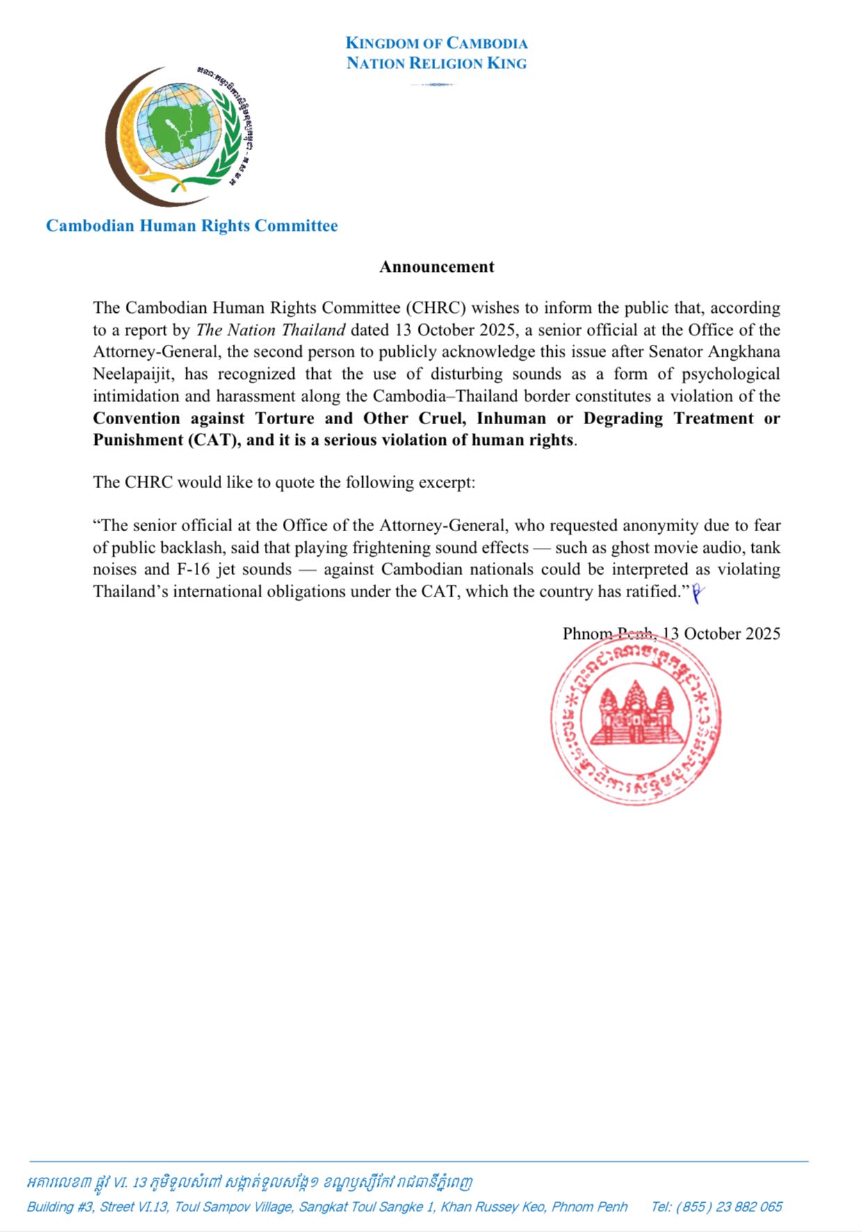 On 13 October 2025, the Cambodian Human Rights Committee (CHRC) issued a public notice highlighting warnings and sequential acknowledgments from senior Thai officials. These officials recognized that the Thai side’s use of noise for intimidation and psychological harassment is a serious human rights violation.