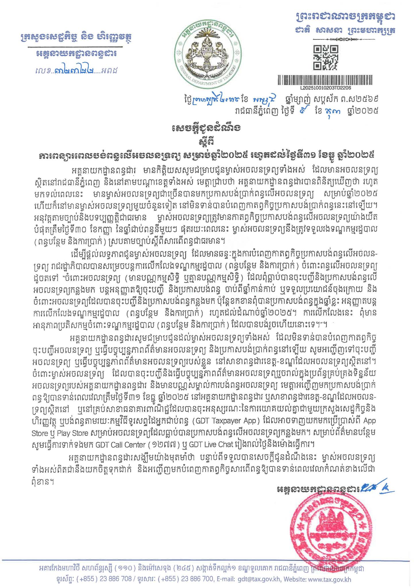 On 9 October 2025, the General Department of Taxation (GDT) issued a notice announcing an extension of the deadline for the payment of the 2025 Tax on Immovable Property until 31 December 2025. This extension was granted because many property owners had not yet fulfilled their obligations to register their property, update their information, or pay the tax for the year. Property owners who have not yet registered or paid the tax are urged to complete these tasks by the new deadline at the Provincial/District Tax Branch where the property is located or at any commercial bank that has signed a Memorandum of Understanding with the Ministry of Economy and Finance.