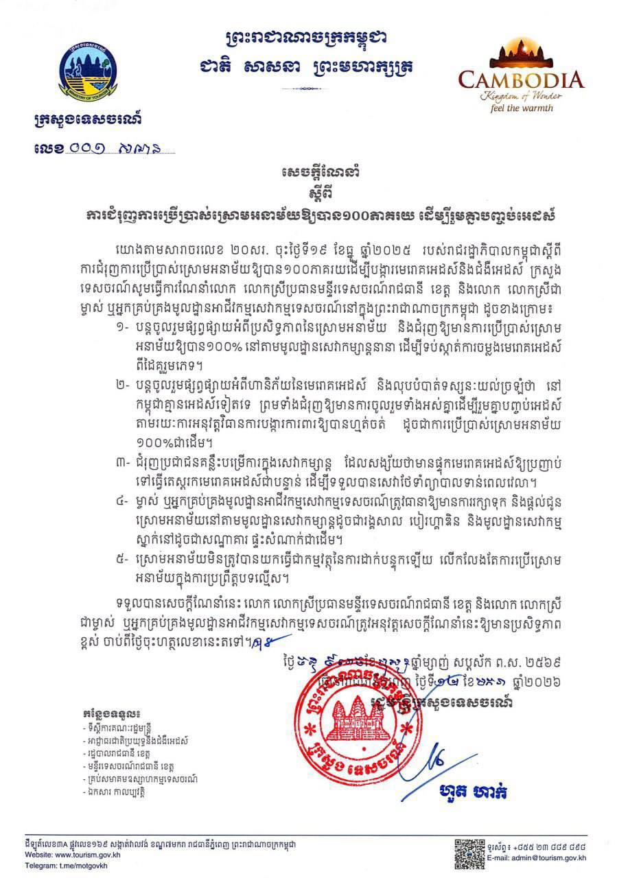 The Ministry of Tourism hereby instructs the Departments of Tourism of the cities and provinces and the owners or managers of tourism service businesses in the Kingdom of Cambodia, as per the attached document.