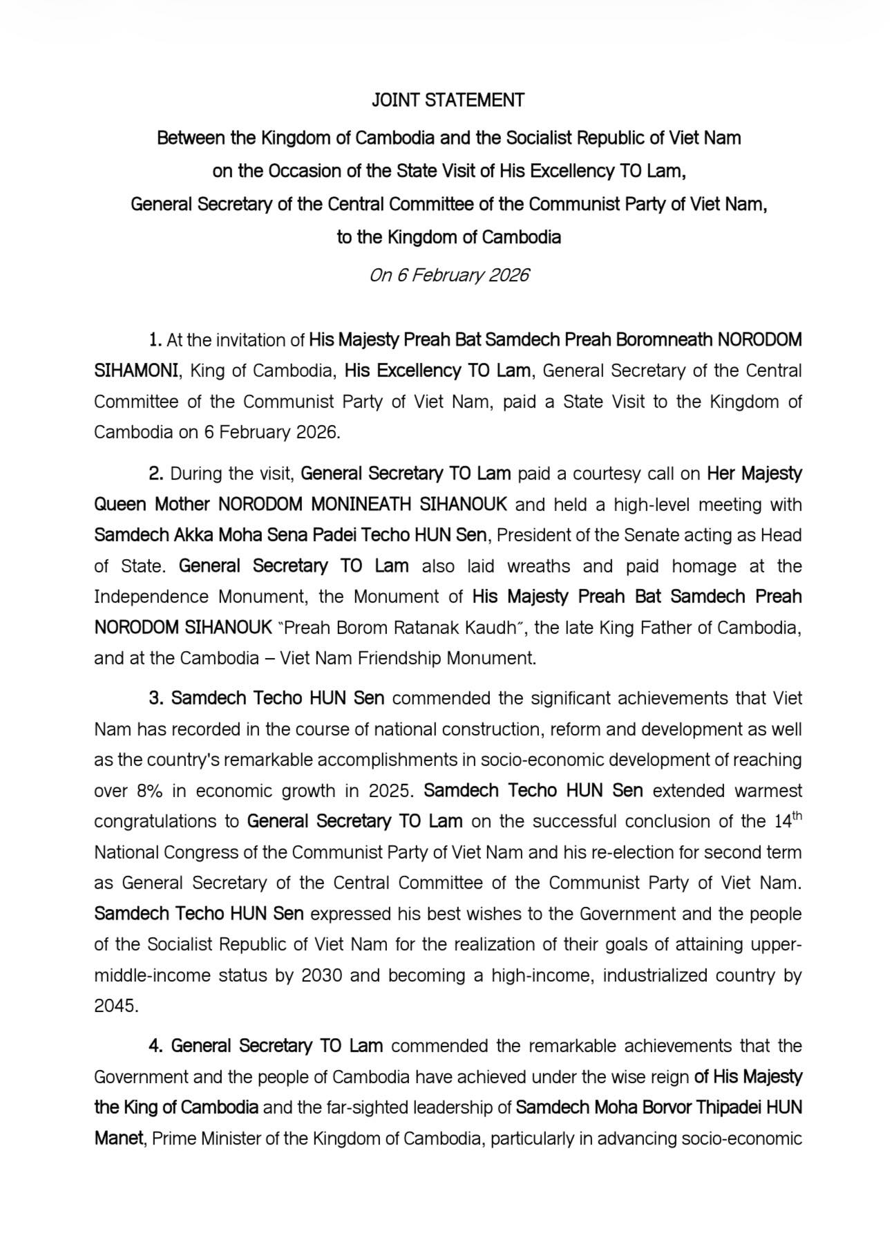 On 6 February 2026, the Ministry of Foreign Affairs and International Cooperation issued a joint statement between the Kingdom of Cambodia and the Socialist Republic of Viet Nam on the occasion of the state visit of His Excellency TO Lam, General Secretary of the Central Committee of the Communist Party of Viet Nam, to the Kingdom of Cambodia.